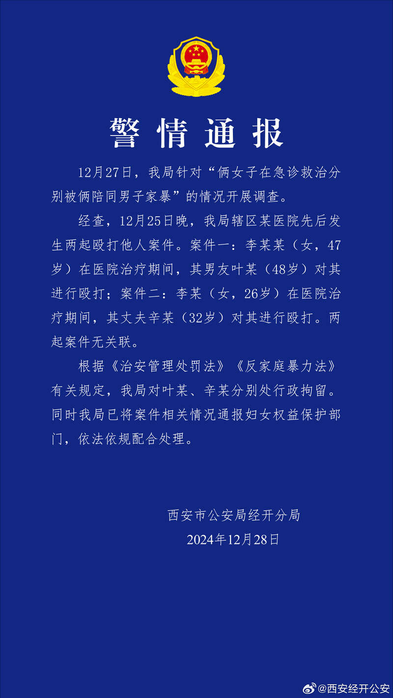 西安警方通报“两女子在急诊分别被家暴”:已行拘两名打人男子