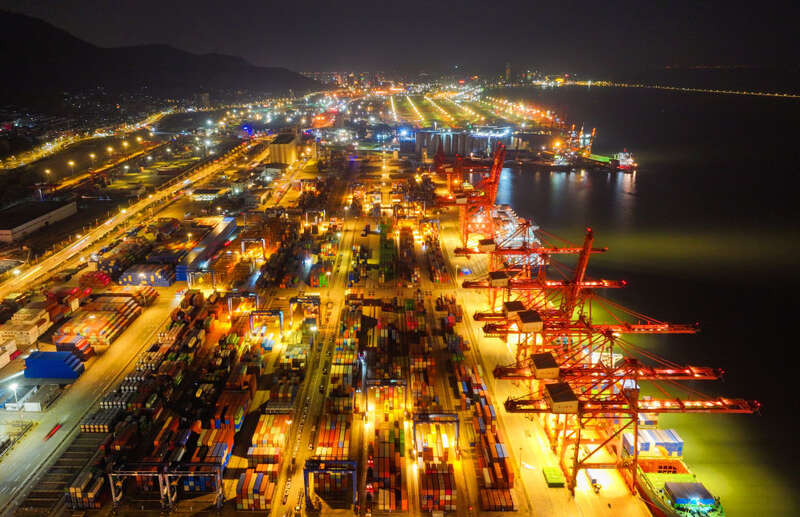 当日,夜幕下的江苏连云港港集装箱码头灯火明亮,工作人员繁忙有序地进行装卸工作。临近年末,江苏连云港港持续提升港口集疏运水平,多措并举加快货物装卸转运效率,力争外贸集装箱吞吐量与出口量再创新高。