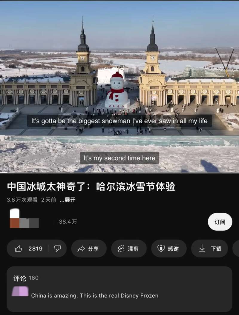 更有海外游客在该博主的视频下留言称,哈尔滨冰雪大世界是现实版的“冰雪奇缘”。