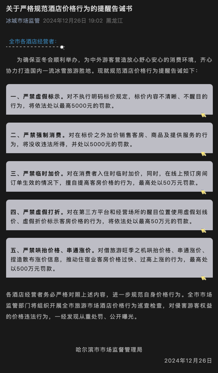 12月26日,哈尔滨市市场监督管理局发布《关于严格规范酒店价格行为的提醒告诫书》(下称《告诫书》),明确“五禁”:严禁虚假标示,严禁强制消费,严禁临时加价,严禁虚假打折,严禁哄抬价格、串通涨价。