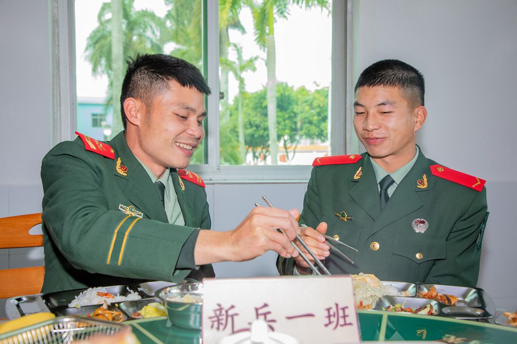2024年12月28日,广西北海,一名带兵班长正在为新战友夹菜。