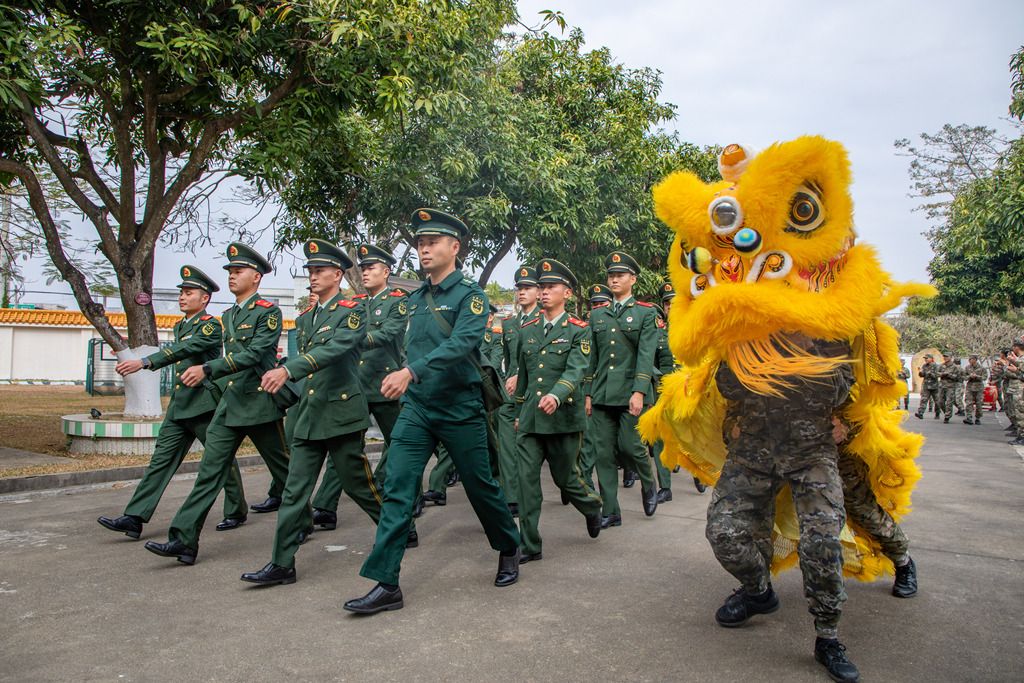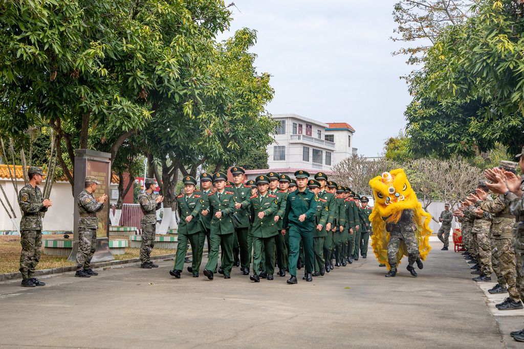 2024年12月28日,广西北海,武警官兵通过“舞狮”的方式欢迎新战友下队。