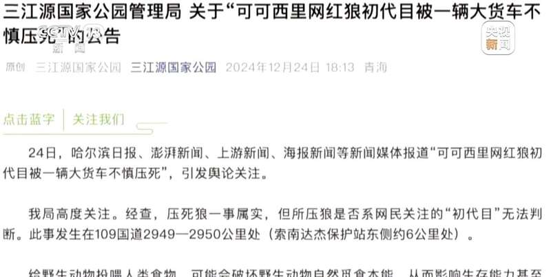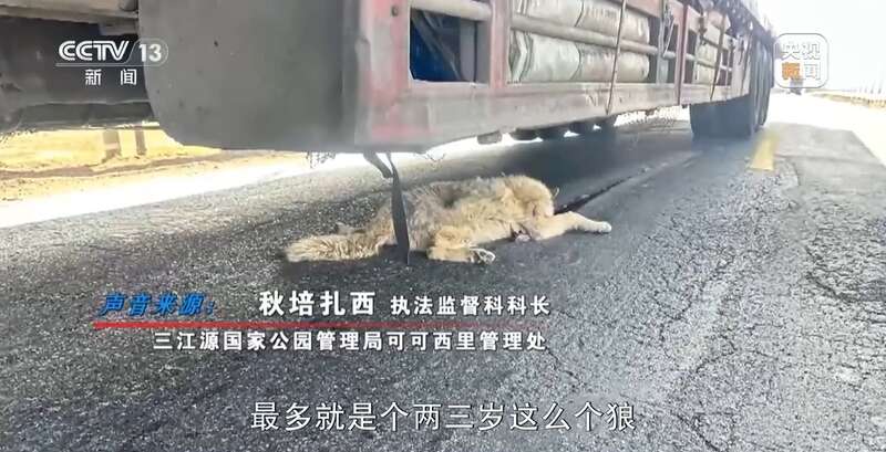 本周一,多名网友在社交平台发文称,疑似被游客投喂食物而变得膘肥体壮的“可可西里网红狼”,在109国道索南达杰保护站东侧约6公里处,被一辆大货车轧死引发关注。一位目击者称,当时这只狼尚有生命体征,他便去保护站寻求帮助。