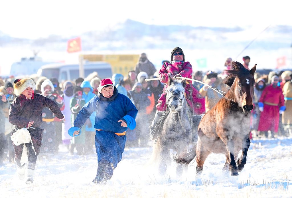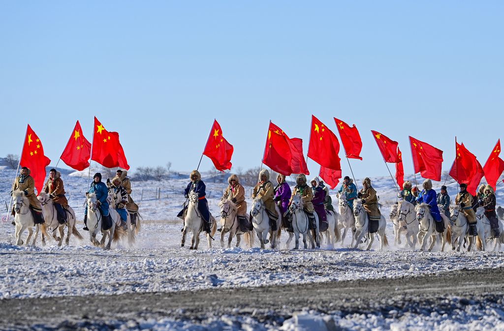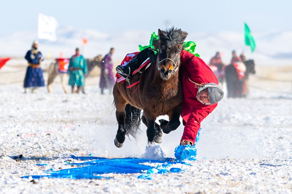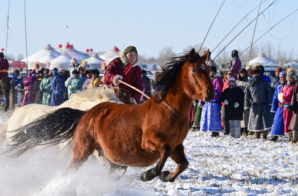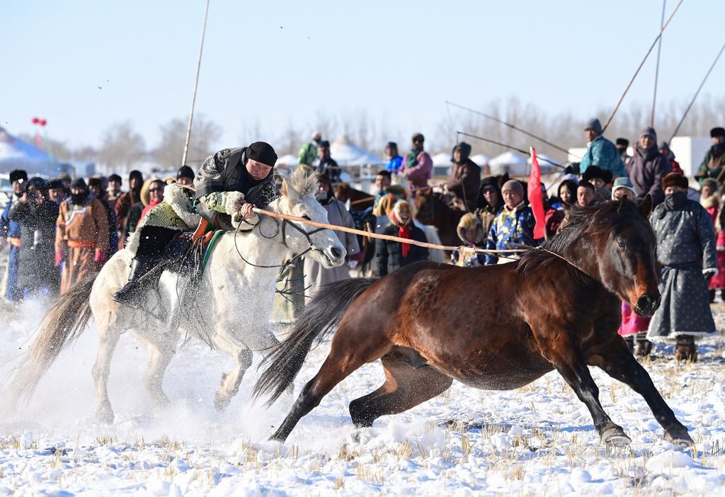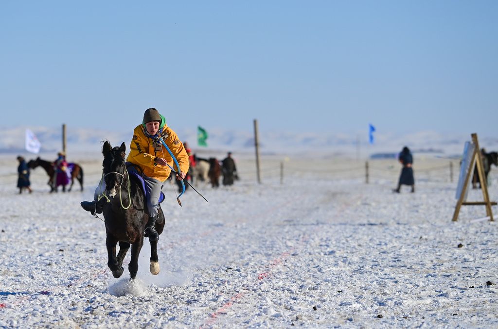 内蒙古锡林郭勒:蒙古马扬蹄踏雪 牧民扬鞭飒英姿