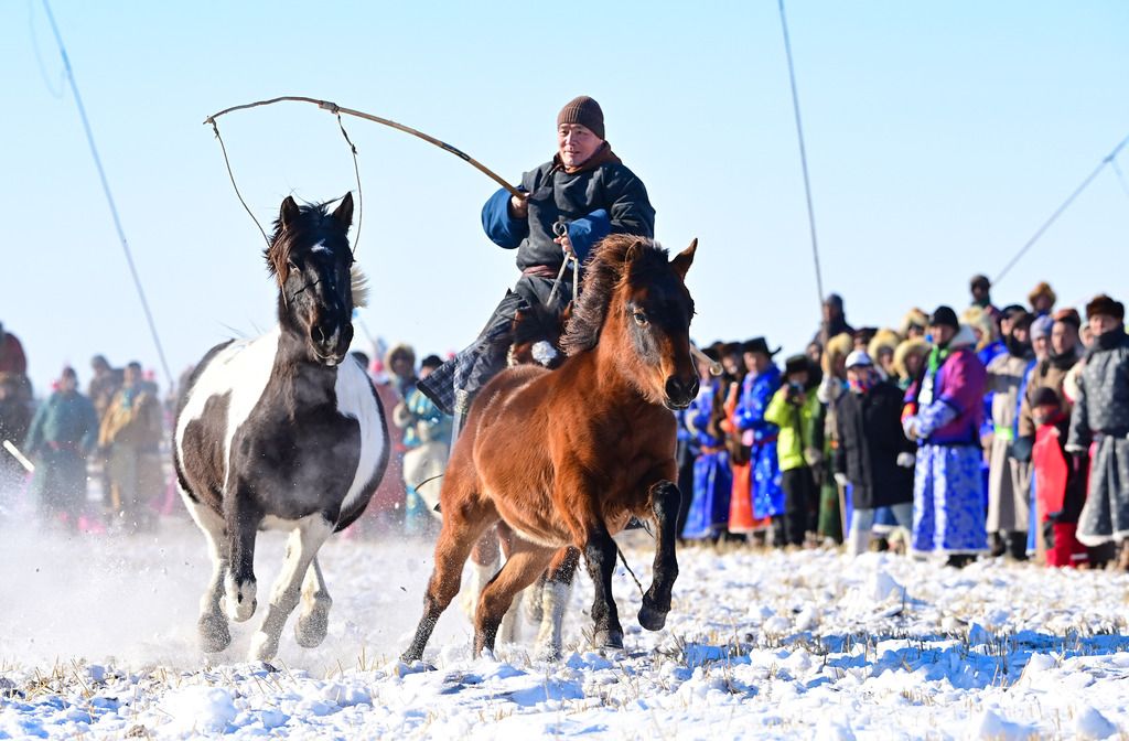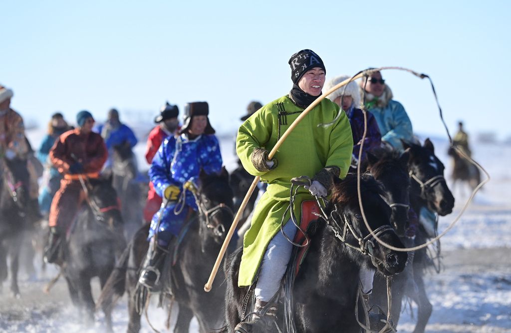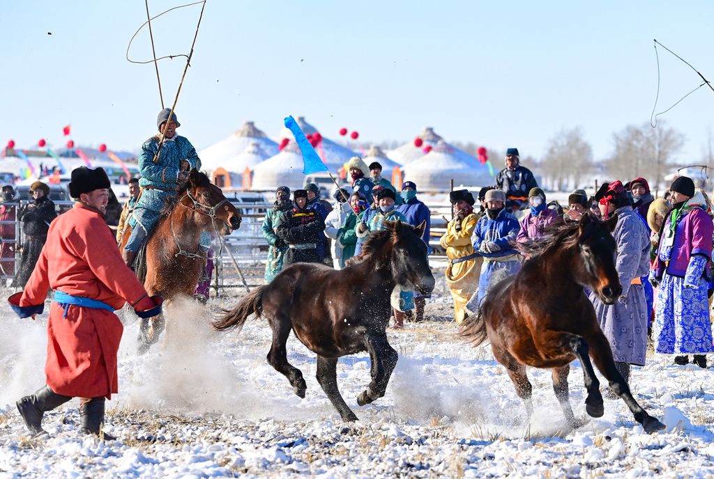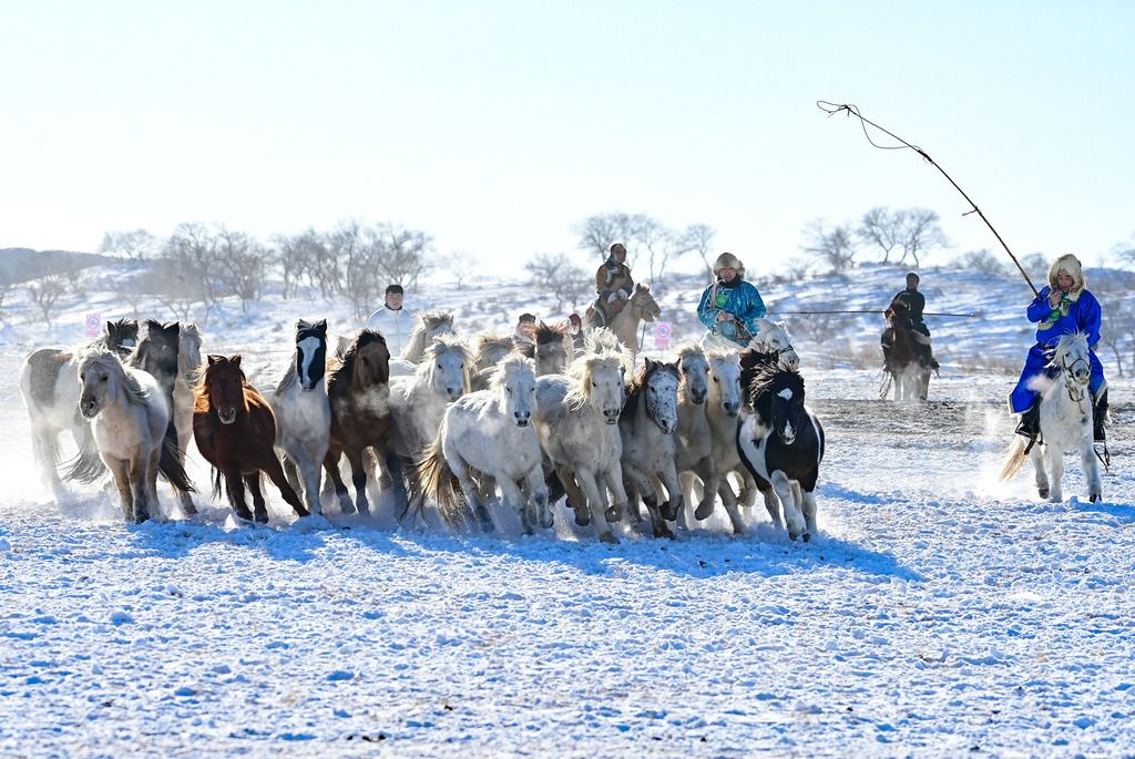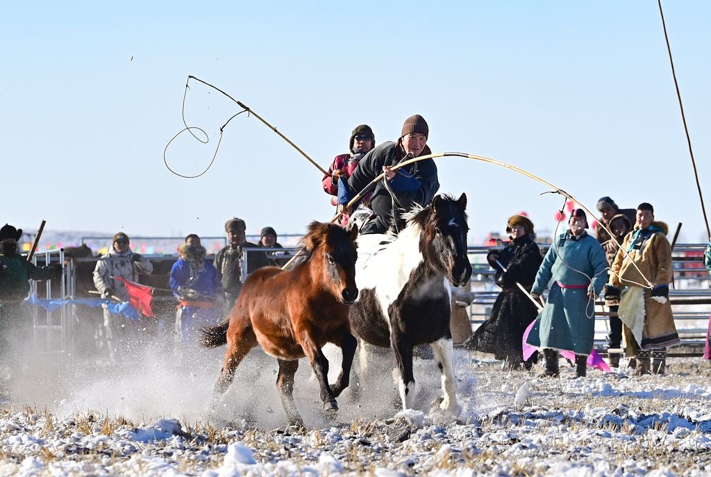 2024年12月28日,内蒙古锡林郭勒,2024锡林郭勒冬季蒙古马超级联赛总决赛在内蒙古自治区锡林郭勒盟锡林浩特市白音锡勒牧场开幕,当地牧民赶着数百匹骏马齐聚现场,进行套马、驯马等蒙古族传统马文化活动,向人们展示骑马驯马的高超本领,欢喜迎接新年到来,吸引众多游客前来观赏。