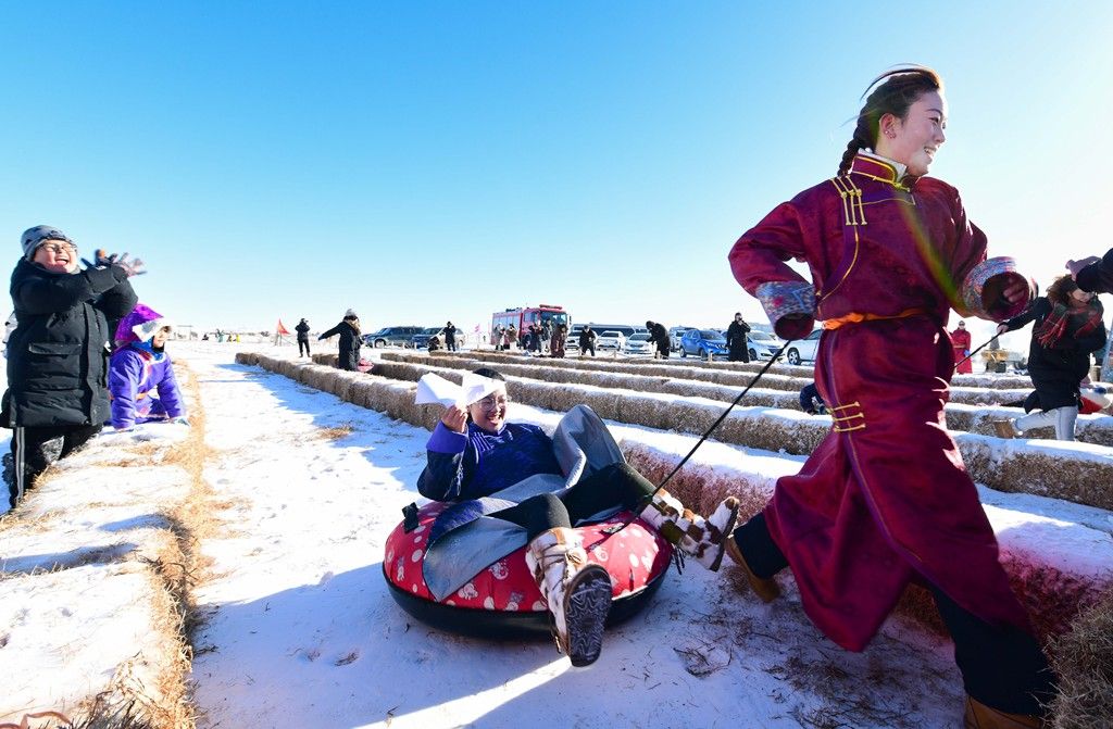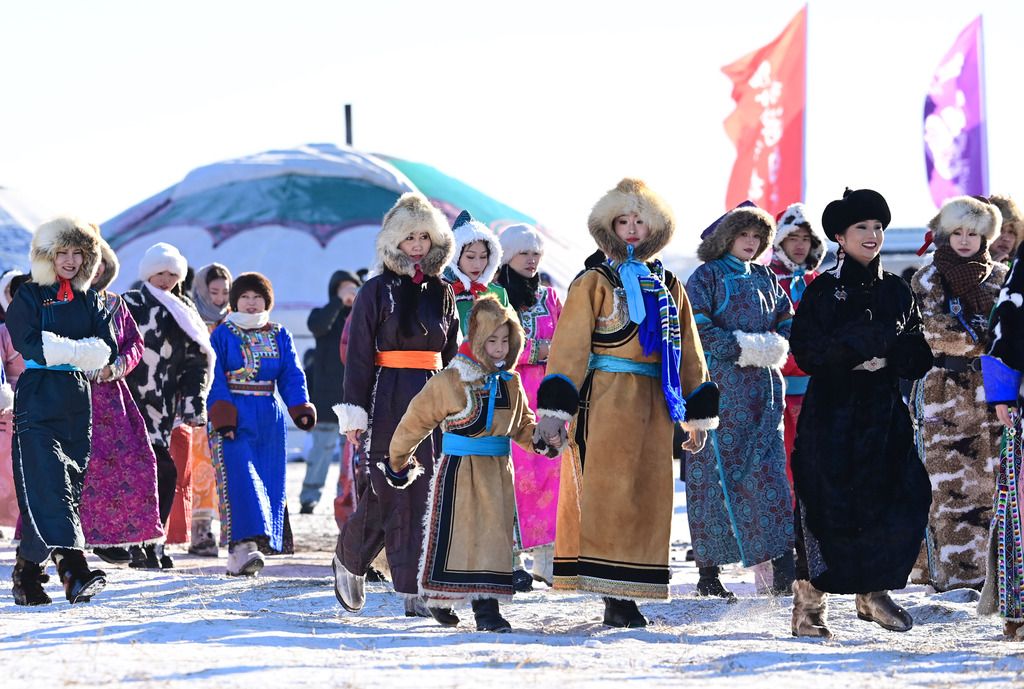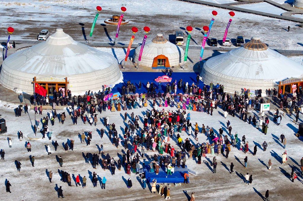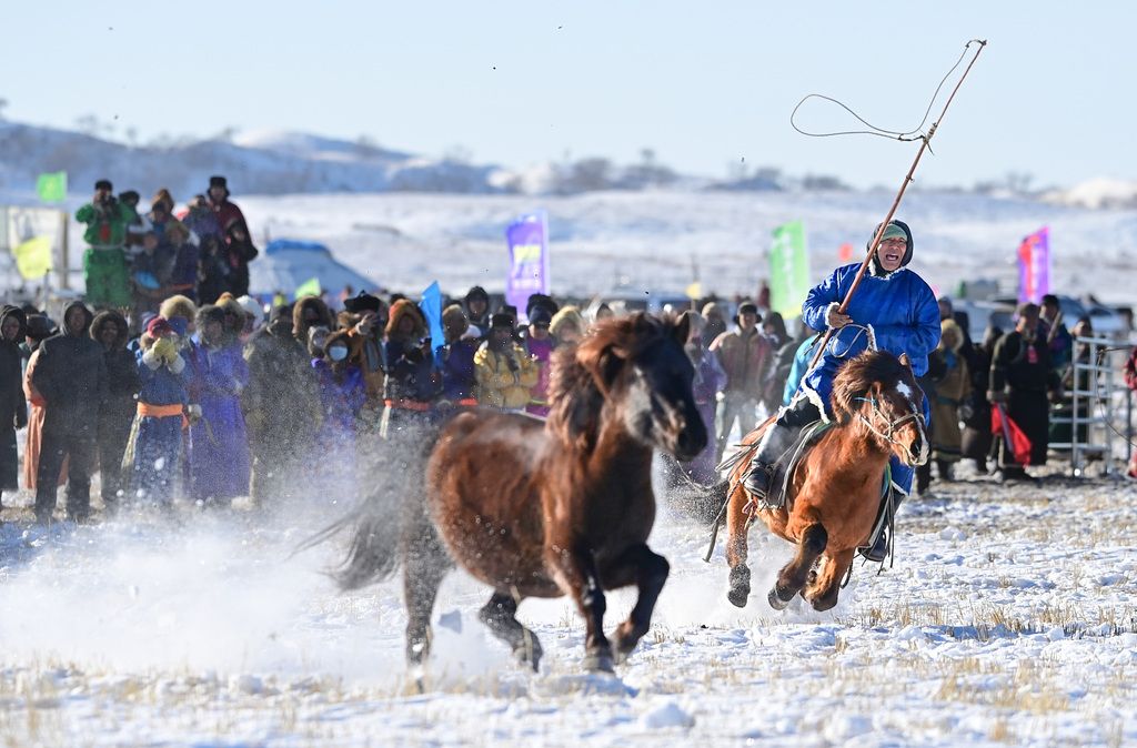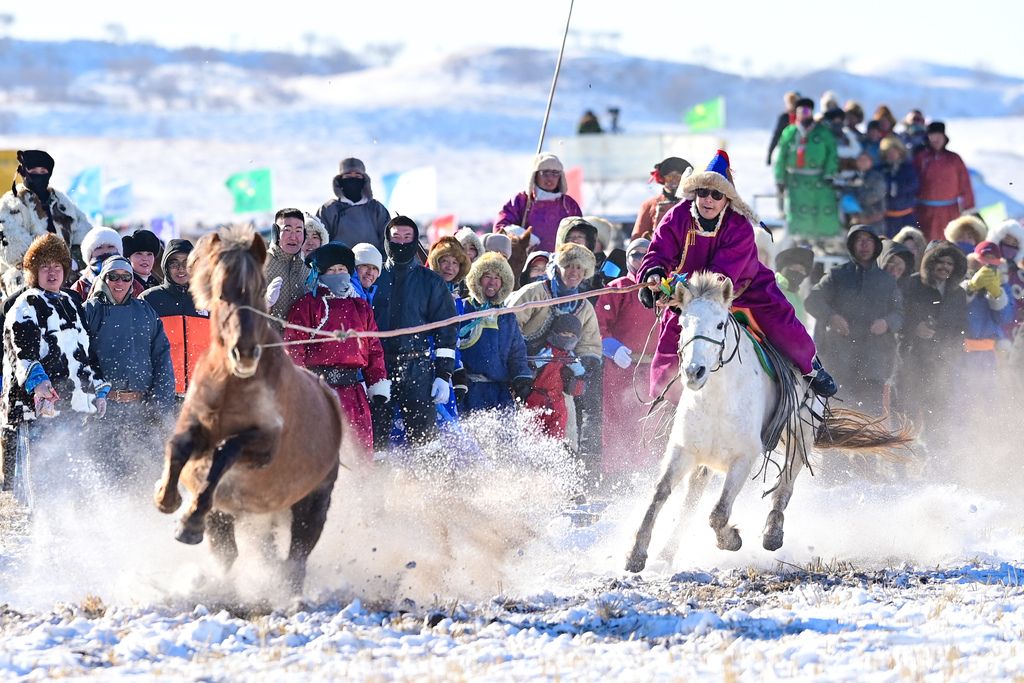 2024年12月28日,内蒙古锡林郭勒,2024锡林郭勒冬季蒙古马超级联赛总决赛在内蒙古自治区锡林郭勒盟锡林浩特市白音锡勒牧场开幕,当地牧民赶着数百匹骏马齐聚现场,进行套马、驯马等蒙古族传统马文化活动,向人们展示骑马驯马的高超本领,欢喜迎接新年到来,吸引众多游客前来观赏。