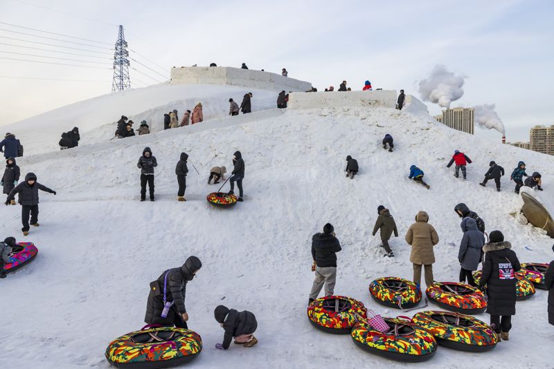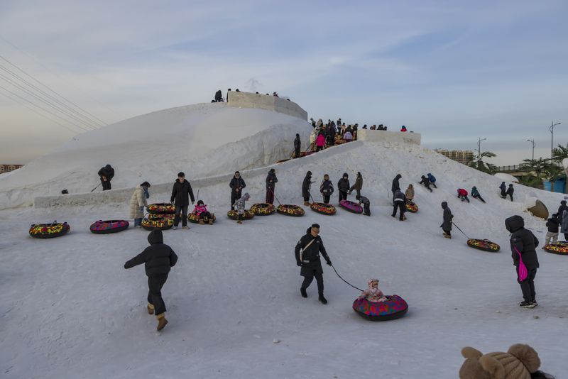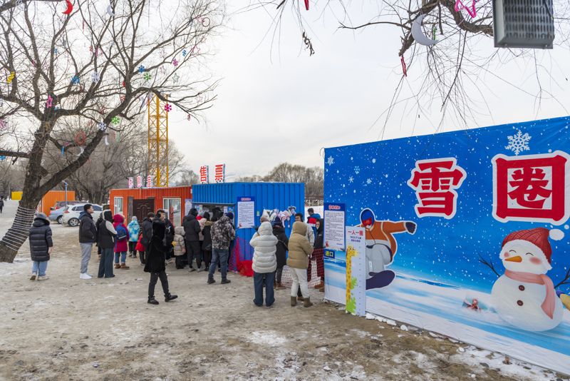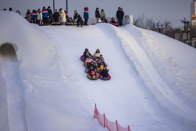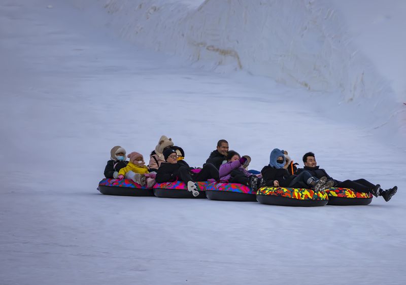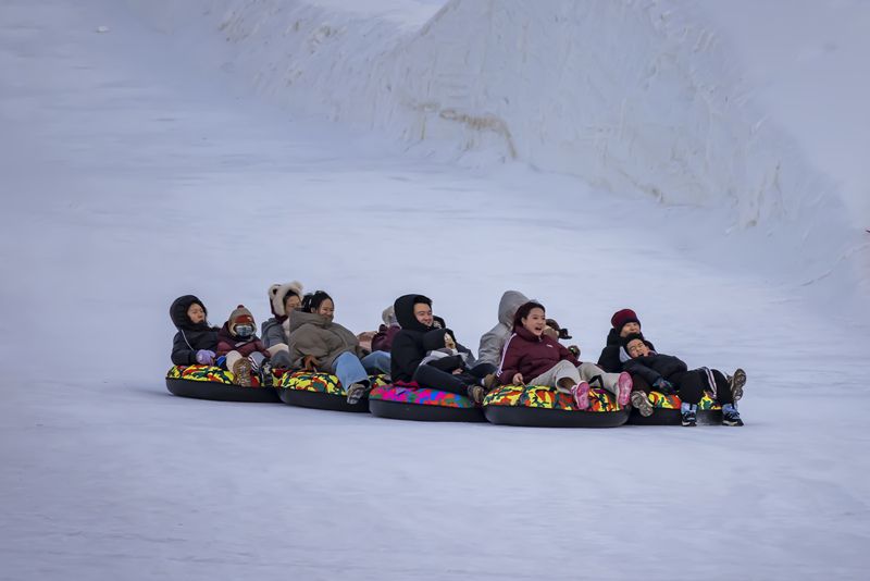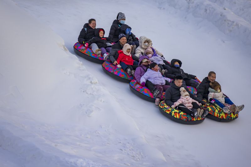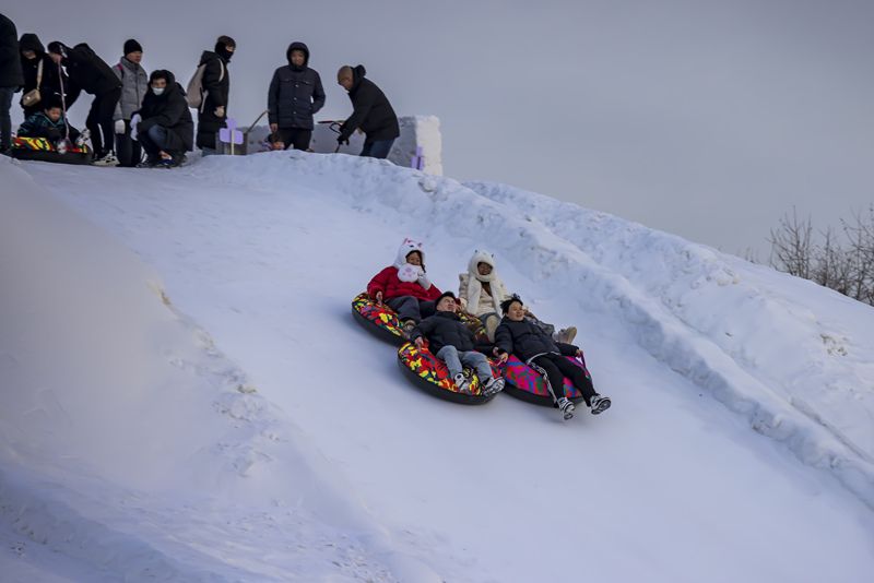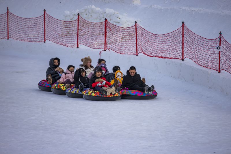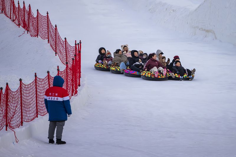 2024年12月29日,吉林市松花江畔,众多市民和游客在悦江摊戏雪乐园玩耍。打雪圈、爬雪山,家长和儿童乐此不疲热闹非凡。