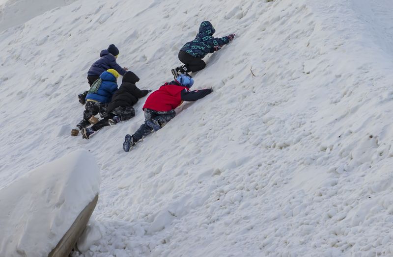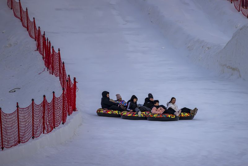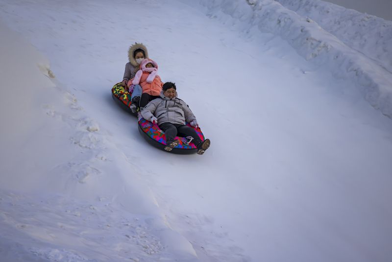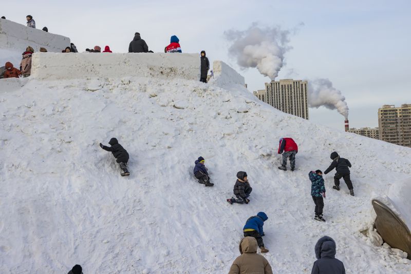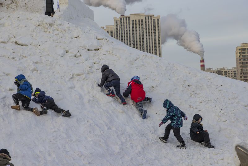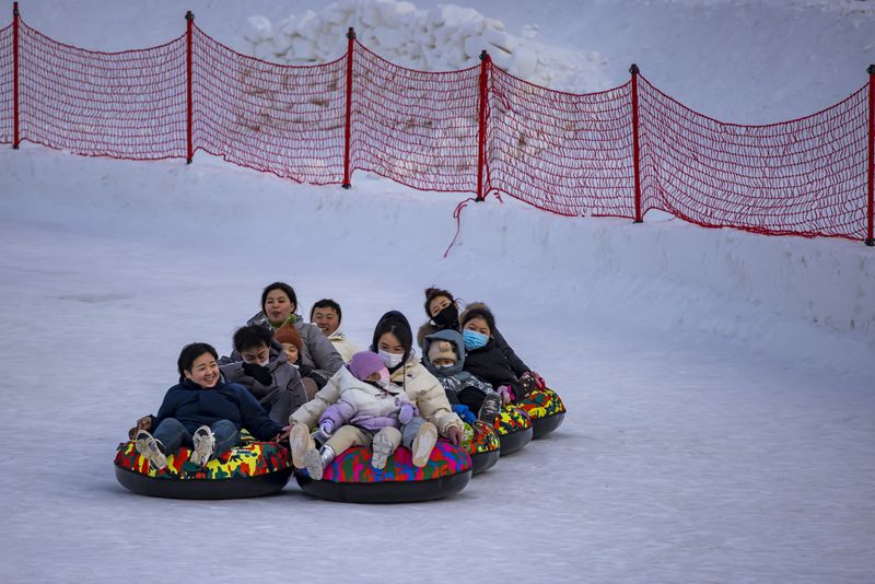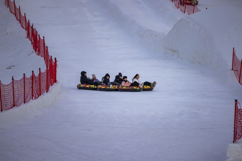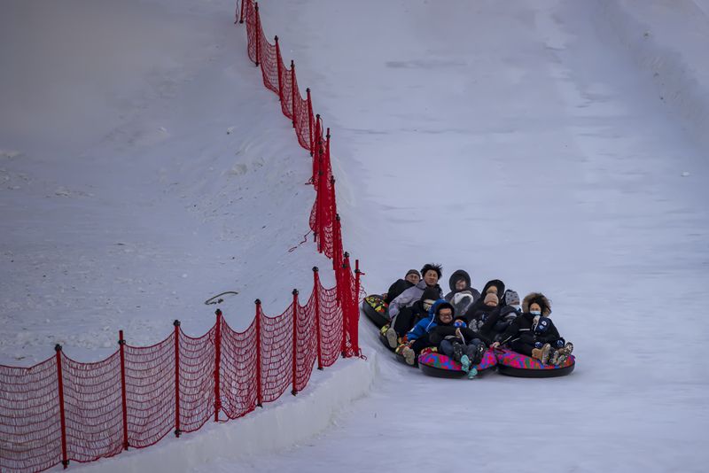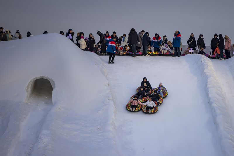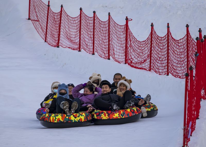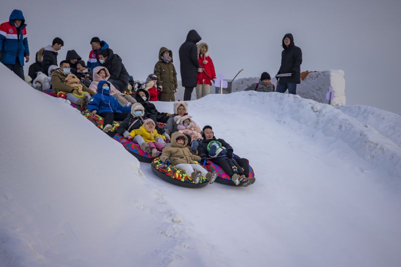 2024年12月29日,吉林市松花江畔,众多市民和游客在悦江摊戏雪乐园玩耍。打雪圈、爬雪山,家长和儿童乐此不疲热闹非凡。