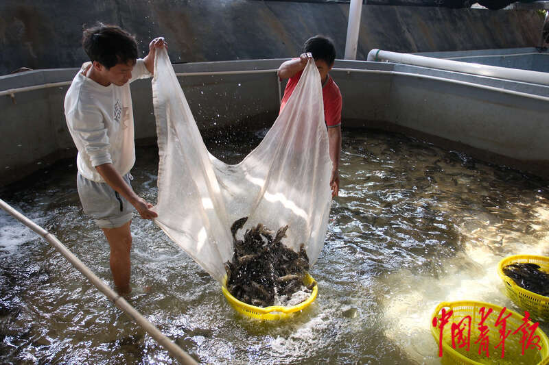 12月19日,海南乐东,在洪小贺与父亲的渔业养殖基地,两名工作人员正在使用渔网搬鱼,将石斑鱼划分成不同规格,再清洗池塘,来去除残饵和粪便积累,控制病菌滋生和寄生虫隐患,保障石斑鱼的健康生长、提高养殖效益。中青报·中青网记者 田嘉硕/摄