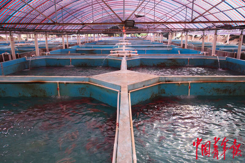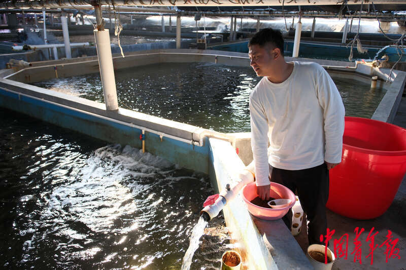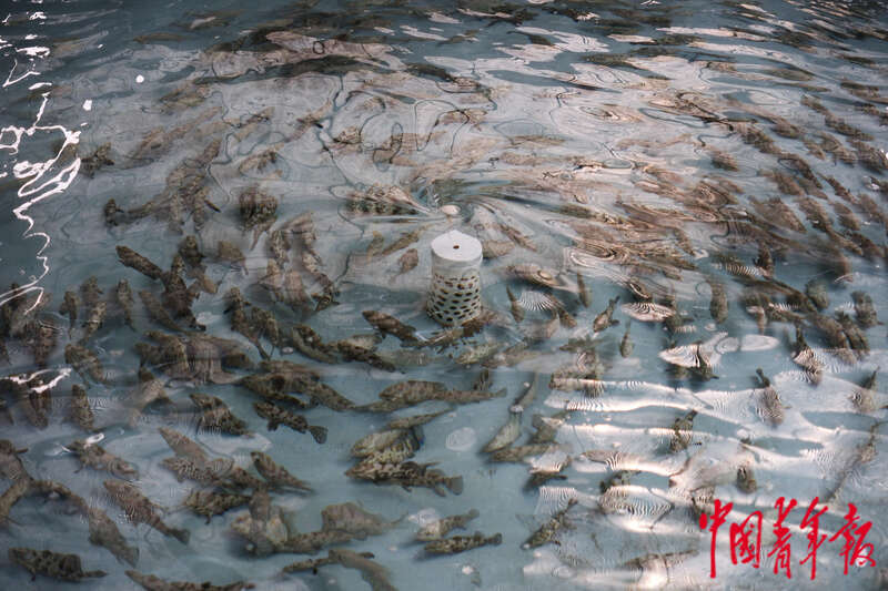 12月19日,海南乐东,洪小贺正在自家70亩的养殖基地向石斑鱼苗投喂饲料。洪家三代均从事渔业生意。最初,洪小贺的爷爷在台湾创业,从事传统渔业养殖,父亲洪宜展在上世纪90年代来到海南从事现代化渔业养殖。2012年,刚刚成年的洪小贺跟随父亲的脚步,从台湾来到海南创业,开启自己的科研渔业养殖之路。十余年间,他积极与国内相关大学院校及科研机构合作,成立“名贵海水鱼繁育技术团队”,攻克了人工孵化和养殖金枪鱼、章红鱼等难题。并在鱼类新品种开发、良种选育、科学制种产业化生产等方面都有了长足的发展。个人成绩突出的同时,他还积极帮助同行及养殖户,推动当地水产养殖技术迭代。此外,他还积极为海峡两岸渔业合作、技术交流搭建桥梁。他表示,海南自贸港建设给渔业转型升级带来了新机遇,基于海南相对独立的地理单元和温润的热带气候等比较优势,加上海南自贸港建设和全球动植物种质资源引进中转基地的政策优势,企业可以借此引进优质、正规的国外种苗到海南繁育,这些都让海南水产种业发展更具竞争力。中青报·中青网记者 田嘉硕/摄