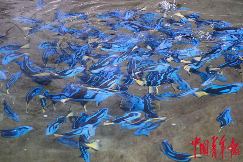 12月19日,海南乐东,洪小贺与父亲的渔业养殖基地繁育的观赏性海水鱼“蓝吊”。中青报·中青网记者 田嘉硕/摄