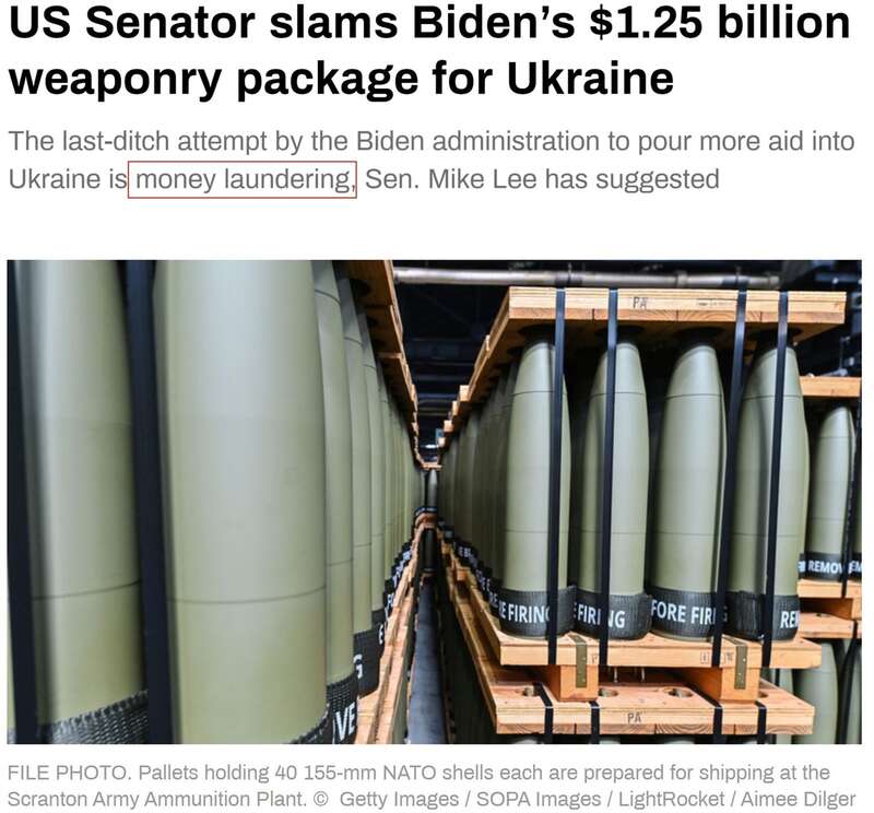 “今日俄罗斯”电视台报道称,参议员迈克·李认为,拜登政府向乌克兰提供新的“豪华武器包”的提议是“洗钱”行为。