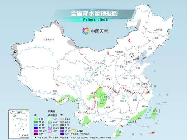元旦当天,新疆北疆北部和南疆西部山区、川西高原南部、内蒙古东北部等地部分地区有小雪或雨夹雪,其中,新疆南疆西部山区等地部分地区有中到大雪。西藏东南部、四川盆地大部、贵州西北部、云南南部、广东南部沿海、福建沿海、海南岛中东部、台湾岛等地部分地区有小雨。
