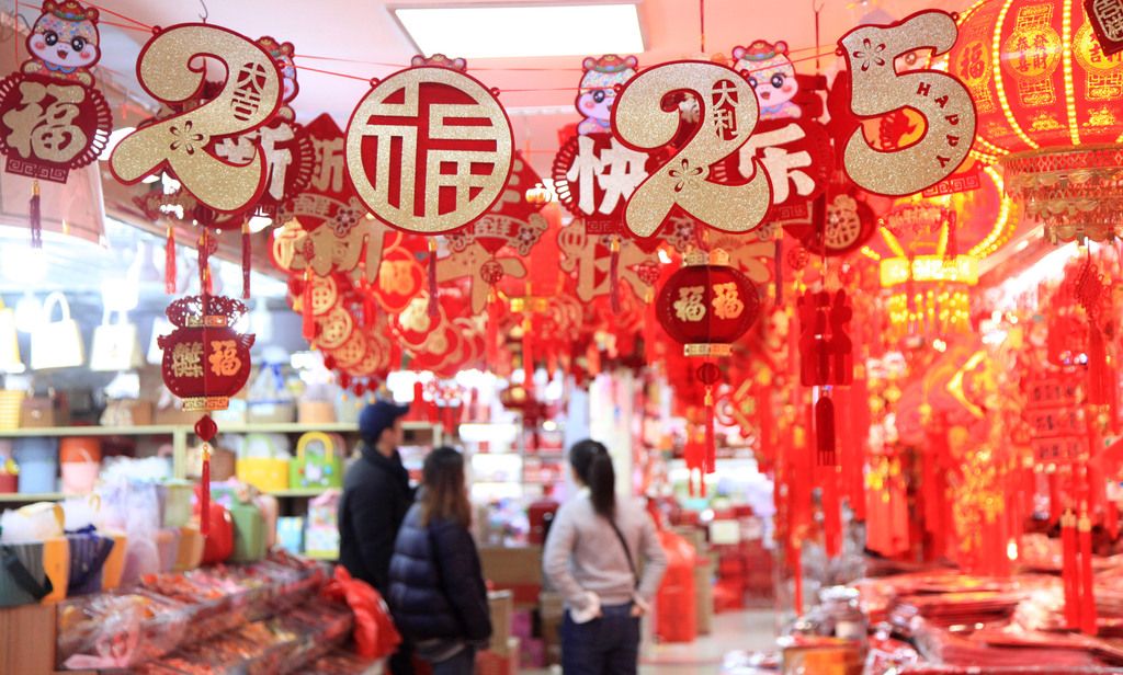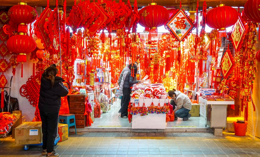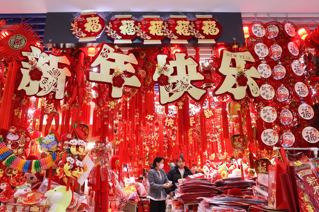 2024年12月29日,元旦、春节临近,新年饰品火红上市,增添了节日气氛,吸引不少市民前来选购,让年味更浓。