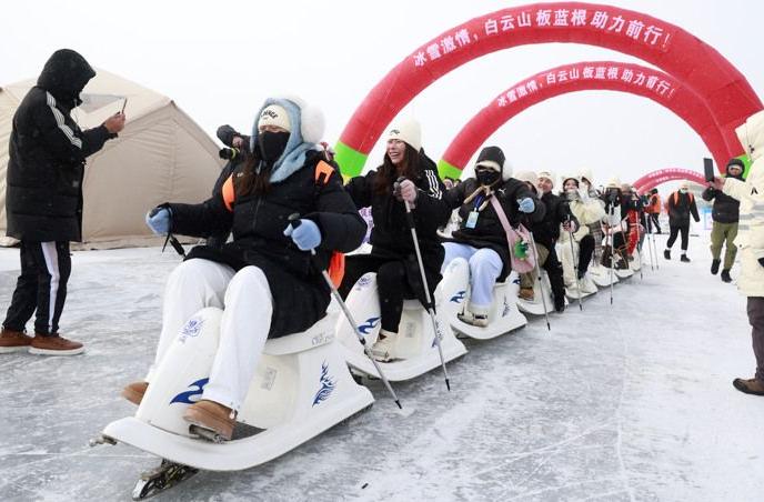 哈尔滨:冰上运动新玩法 小冰龙首尾相接变身大冰龙