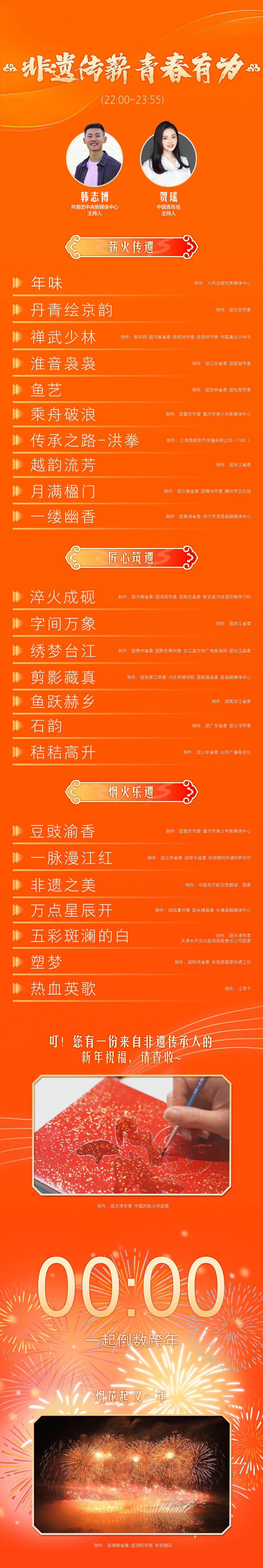 20:00,“非遗传薪·青春有为”节目中,能够看到多位非遗传承人、大中小学的青少年代表,带来精彩丰富的非遗展示。