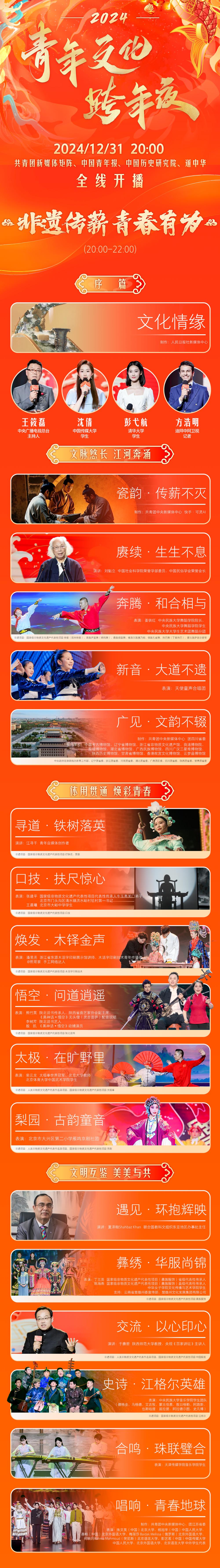 今晚20:00整,由共青团中央宣传部、中国社会科学院文化发展促进中心、中国青年报社、中国青年出版总社共同主办,中国历史研究院特别支持,共青团中央新媒体中心、中青在线、中国青少年新媒体协会承办的2024“青年文化跨年夜”即将震撼来袭!