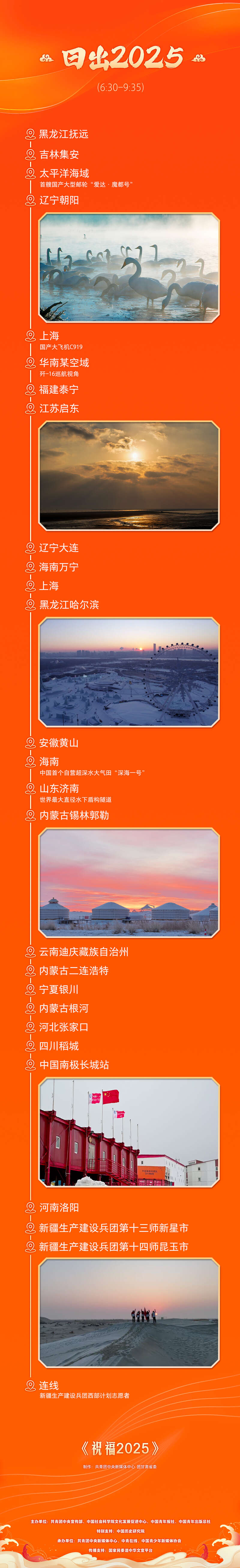 1月1日清晨,让我们跟随镜头一起欣赏各地日出美景,共同领略祖国的山河壮丽,气象蓬勃;伴随着红日初升,元气满满地开启梦想的新征程。同时,展播西部计划志愿者学习习近平总书记新年贺词的感悟,展现青年群体在乡村振兴、社会服务、卫国戍边、科技创新、绿色发展领域挺膺担当的群像。