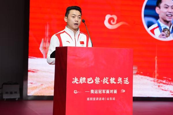 12月27日,邹敬园在“决胜巴黎·绽放奥运——奥运冠军面对面”巡回宣讲山东站活动上发表演讲。活动主办方供图