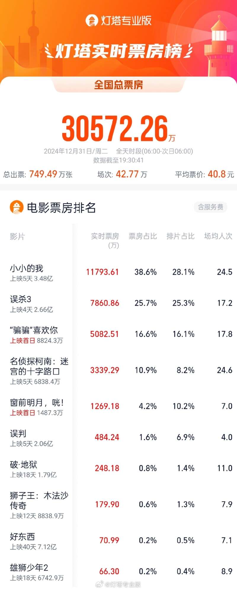 据灯塔专业版,2024年跨年档(12月31日)大盘票房突破3亿!