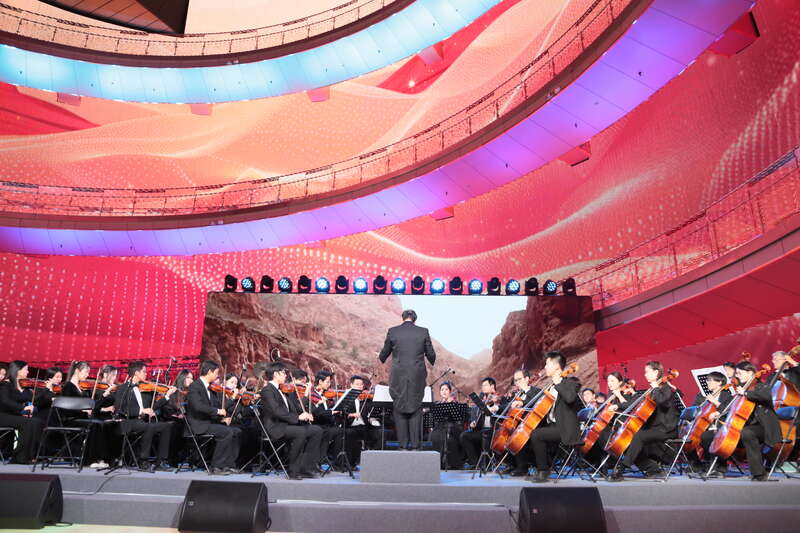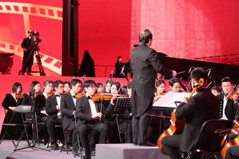 当天,在中国电影博物馆中央圆厅,一系列精心挑选的经典曲目陆续上演。《红旗颂》以其雄壮的旋律唤起了人们对历史的深刻记忆,《红色娘子军组曲》则以其激昂的节奏展现了女性力量;《我爱你中国》和《我的祖国》等曲目以其深情的旋律表达了对祖国的热爱和赞美。此外,音乐会还呈现了外国经典歌曲《友谊地久天长》和《铃儿响叮当》等,这些曲目不仅跨越了国界,也连接了不同文化之间的情感。京剧名曲《夜深沉》的加入,展现了中国传统戏曲的魅力,为音乐会增添了一份东方的神秘与优雅。