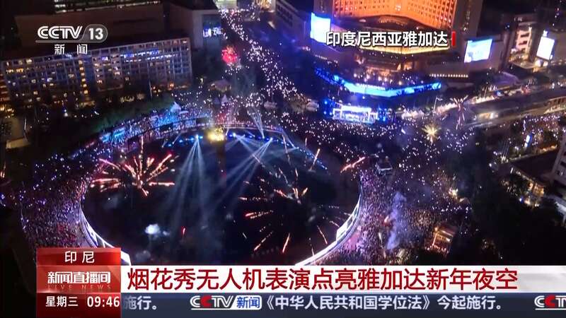 随着新年倒计时归零,印度尼西亚雅加达的夜空被密集的烟花点亮,雅加达市中心上空的无人机组成“2025新年快乐”字样,当地还举办了灯光秀活动。