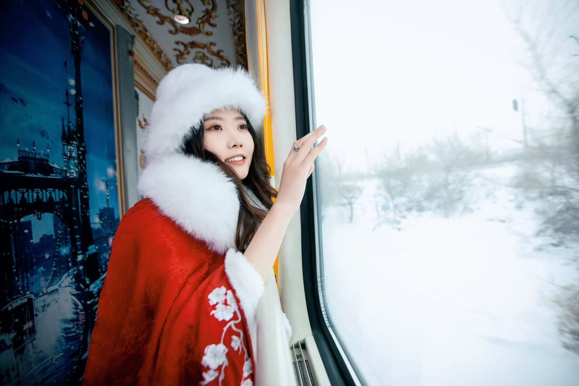 1月2日8时,在哈尔滨开往亚布力的K5197次旅客列车上,游客换上绚丽服装,在不同风格的主题车厢内体验旅拍打卡服务,这是今年开行的首趟冰雪旅拍主题旅客列车。