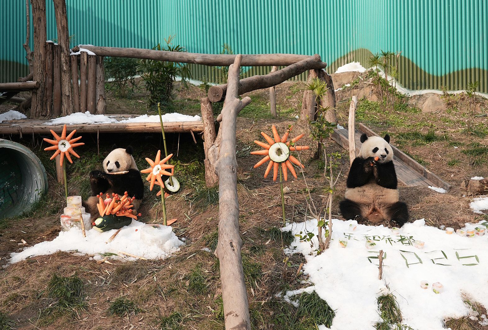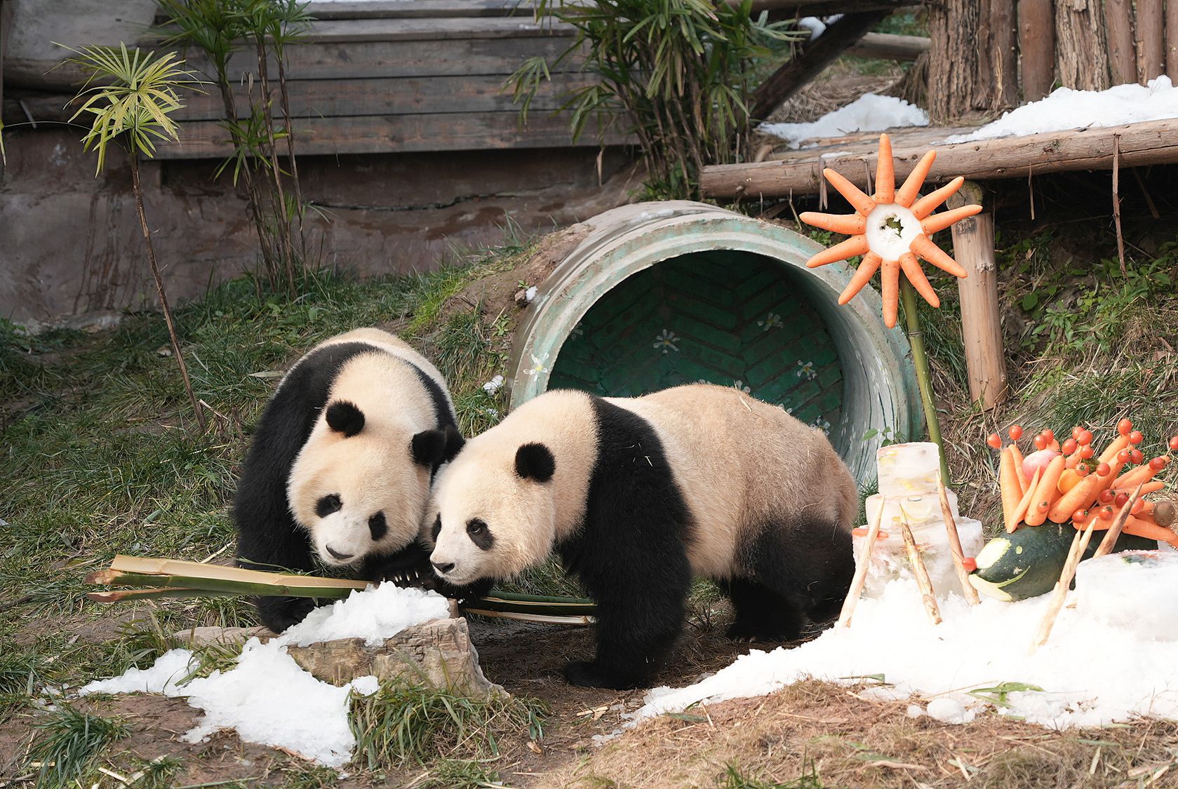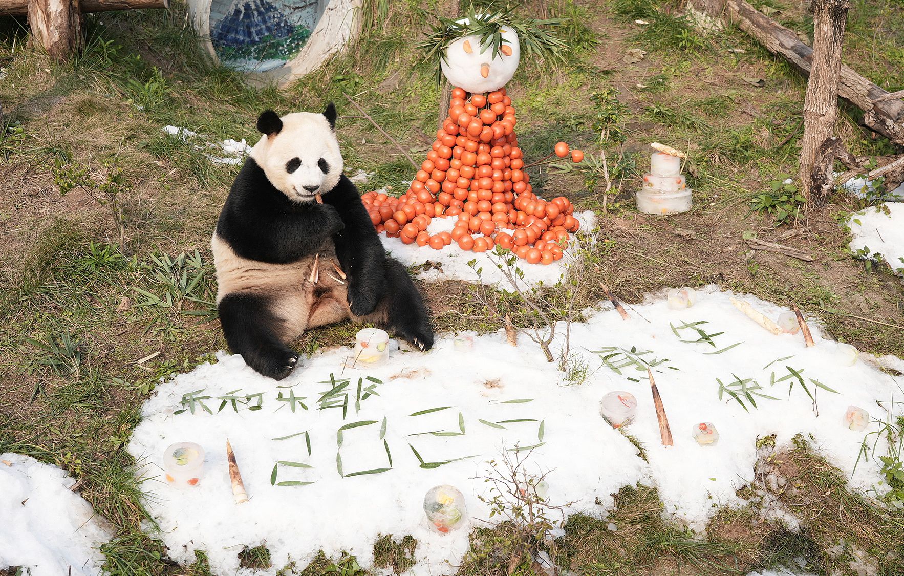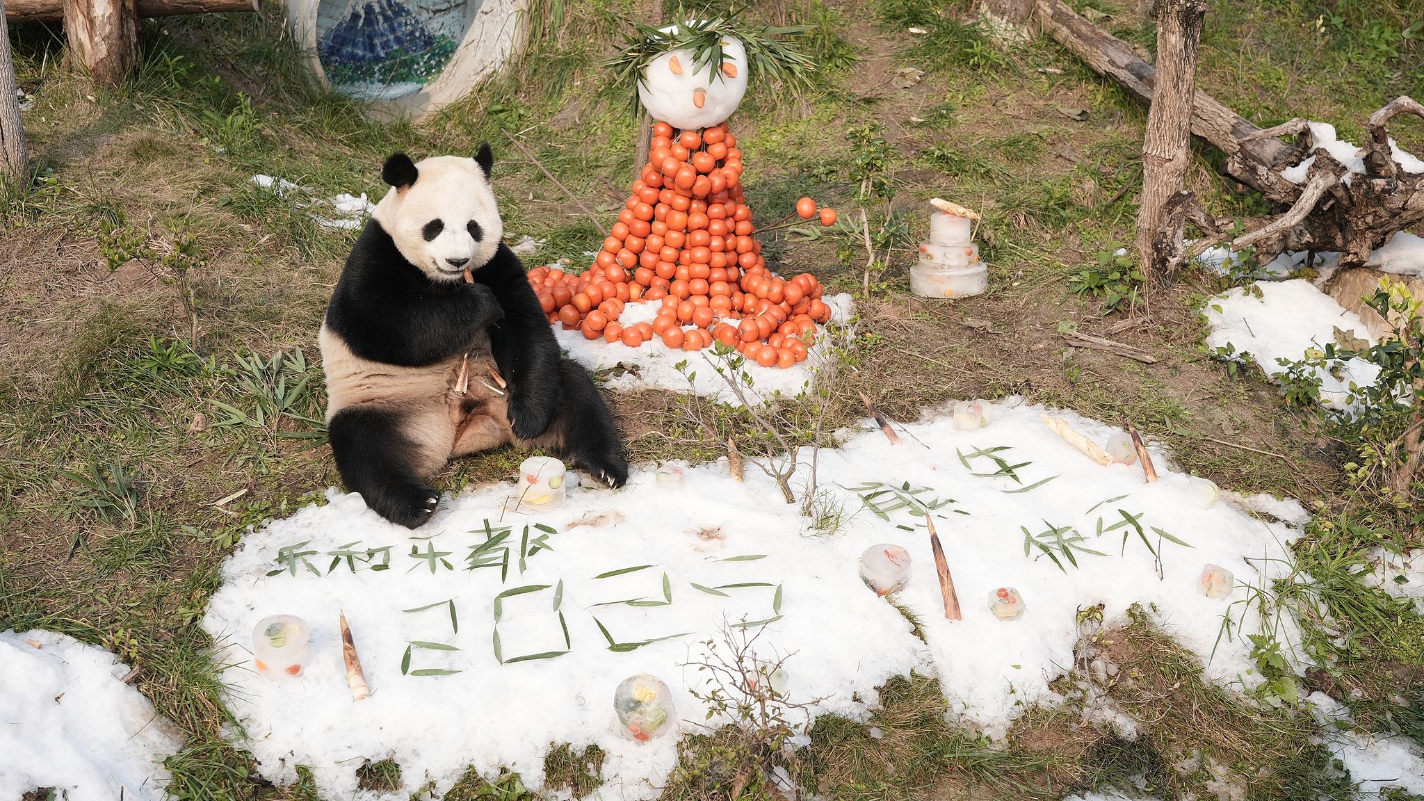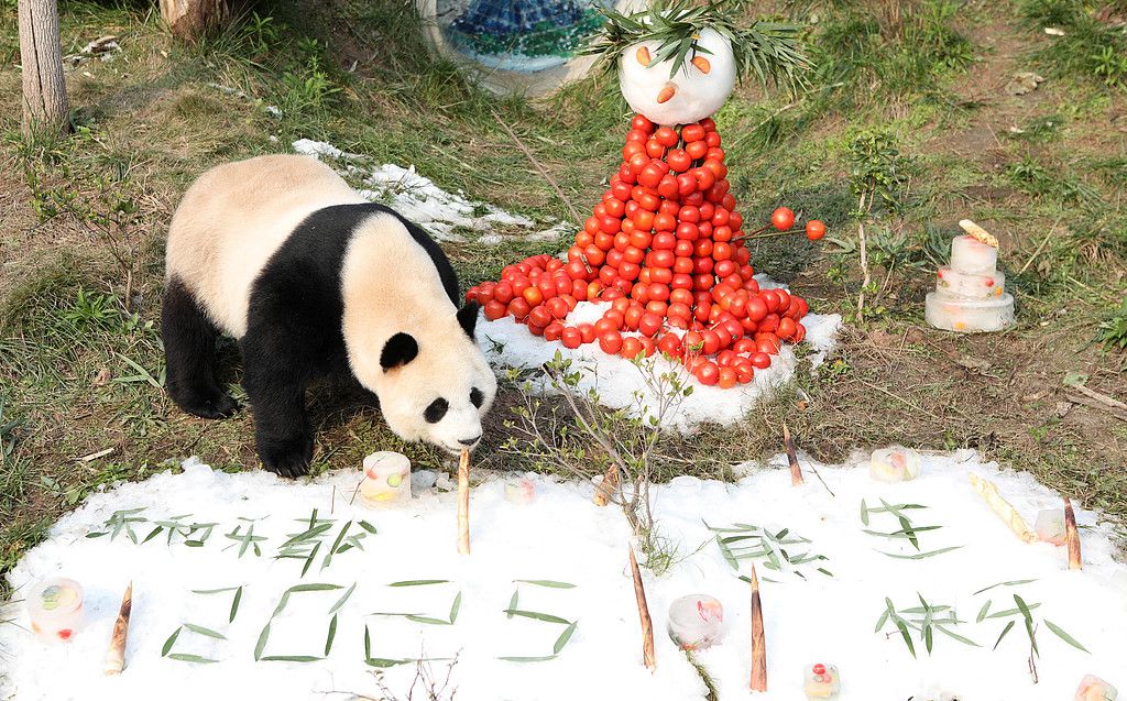 2025年1月1日,重庆永川乐和乐都动物主题乐园为大熊猫“青花”“青露”“爱莲”“巧月”准备了一场“冰雪盛宴”。据悉,在2025年元旦当天,该乐园工作人员用4吨真冰和雪打造了三个冰雪场所,并为大熊猫们准备了特制的“永川秀芽”“豆豉鲫鱼”“狮子头”和“冰淇淋蛋糕”等美食。图为大熊猫在冰雪地里玩耍吃美食。 中新社记者 周毅 摄