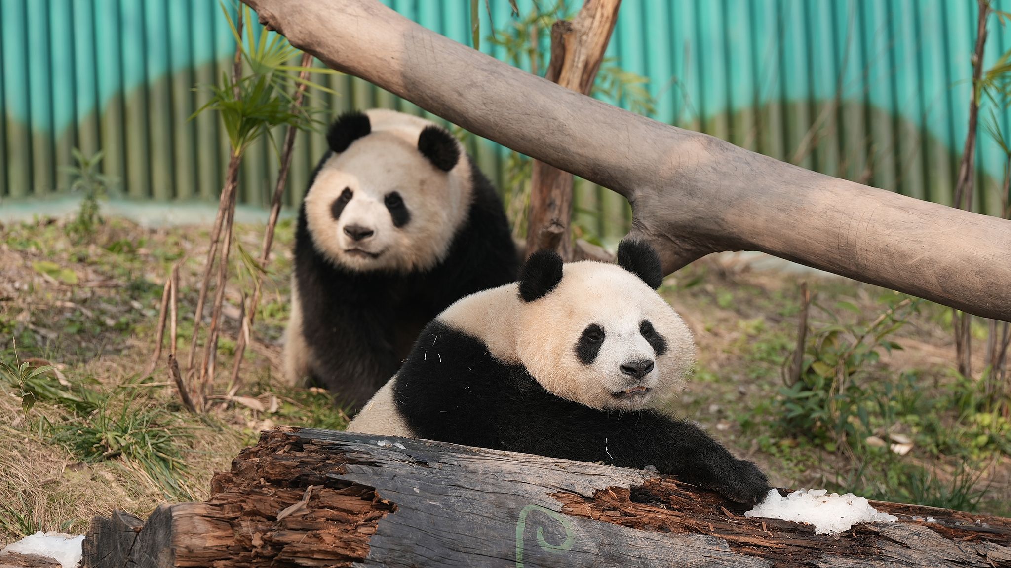 2025年1月1日,重庆永川乐和乐都动物主题乐园为大熊猫“青花”“青露”“爱莲”“巧月”准备了一场“冰雪盛宴”。据悉,在2025年元旦当天,该乐园工作人员用4吨真冰和雪打造了三个冰雪场所,并为大熊猫们准备了特制的“永川秀芽”“豆豉鲫鱼”“狮子头”和“冰淇淋蛋糕”等美食。图为大熊猫在冰雪地里玩耍迎新年。 中新社记者 周毅 摄
