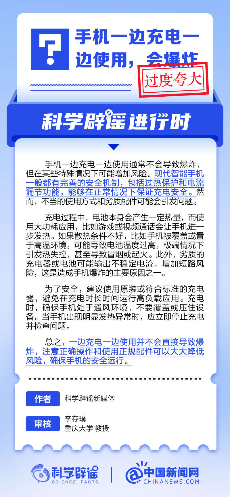 中新网1月2日电 手机一边充电一边使用通常不会导致爆炸,但在某些特殊情况下可能增加相关风险。为了安全,建议使用原装或符合标准的充电器给手机充电,避免在充电时长时间运行高负载应用。充电时,应确保手机处于通风环境,不要覆盖或压住设备。当手机出现明显发热异常时,应立即停止充电并检查问题。(来源:@科学辟谣 中国新闻网微博)