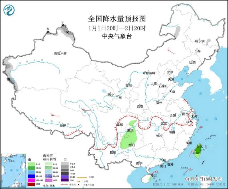 内蒙古东北部、新疆北疆北部和南疆西部山区等地部分地区有小到中雪,其中,新疆阿勒泰、塔城北部和南疆西部山区等地部分地区有大雪。四川东部、重庆西部、贵州中西部、海南岛东南部、台湾岛等地部分地区有小雨,其中,台湾岛中北部部分地区有中雨。