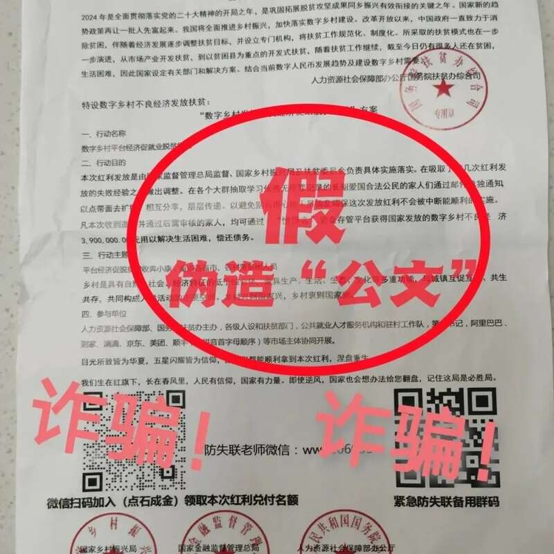 此类骗局往往紧跟时事热点、重点政策,利用群众对政策理解的偏差,通过伪造国家机关印章制作假文件博取信任,利用受害人迫切寻求帮扶的心理,引导受害人点击涉诈链接、下载涉诈APP,以缴纳“激活金”“手续费”“个人所得税”“解冻金”等理由,让受害人不断转账,直至掏空钱包。