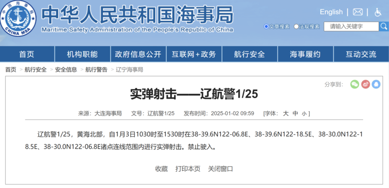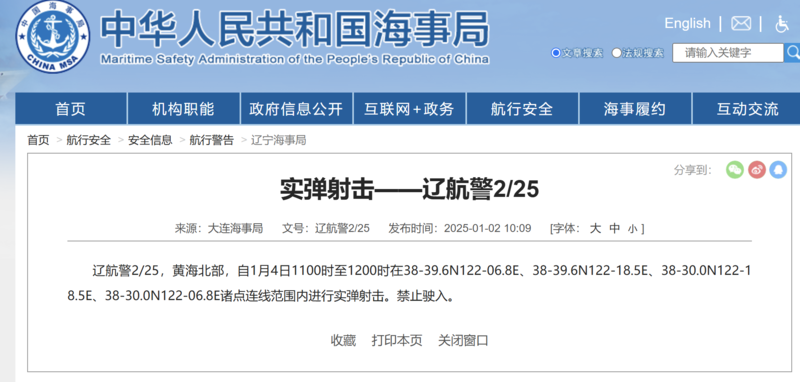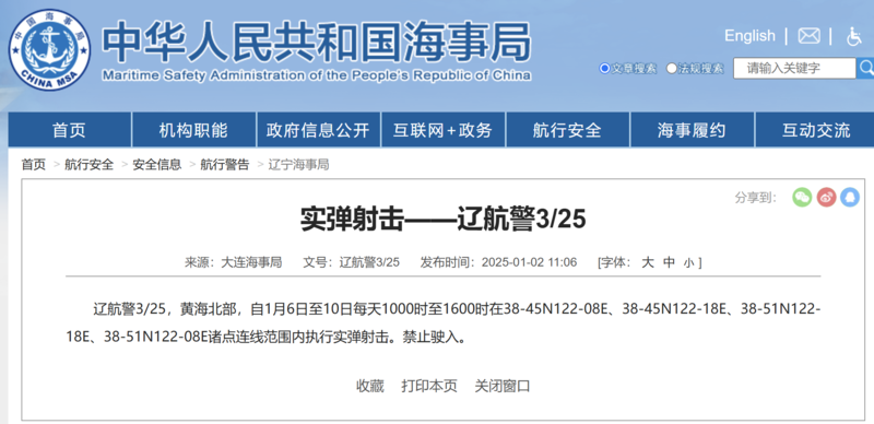 大连海事局发布航行警告,1月3日10时30分至15时30分、1月4日11时至12时、1月6日至10日每天10时至16时,黄海北部部分海域进行实弹射击,禁止驶入。