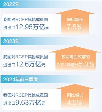 RCEP是世界上参与人口最多、经贸规模最大、最具发展潜力的自由贸易协定。自2022年1月正式生效以来,RCEP持续释放关税减免、通关简化、贸易投资便利化等制度红利,强化区域产供链稳定畅通,推动亚太地区经济进入高质量发展新阶段。中国是RCEP最大经济体,也是高质量实施RCEP的积极推动者。据中国海关总署统计,2022年,中国对RCEP其他成员国进出口12.95万亿元,同比增长7.5%;2023年,中国对RCEP其他成员国进出口12.6万亿元,较协定生效前的2021年增长5.3%;2024年前三季度,中国对RCEP其他成员国进出口9.63万亿元,同比增长4.5%。