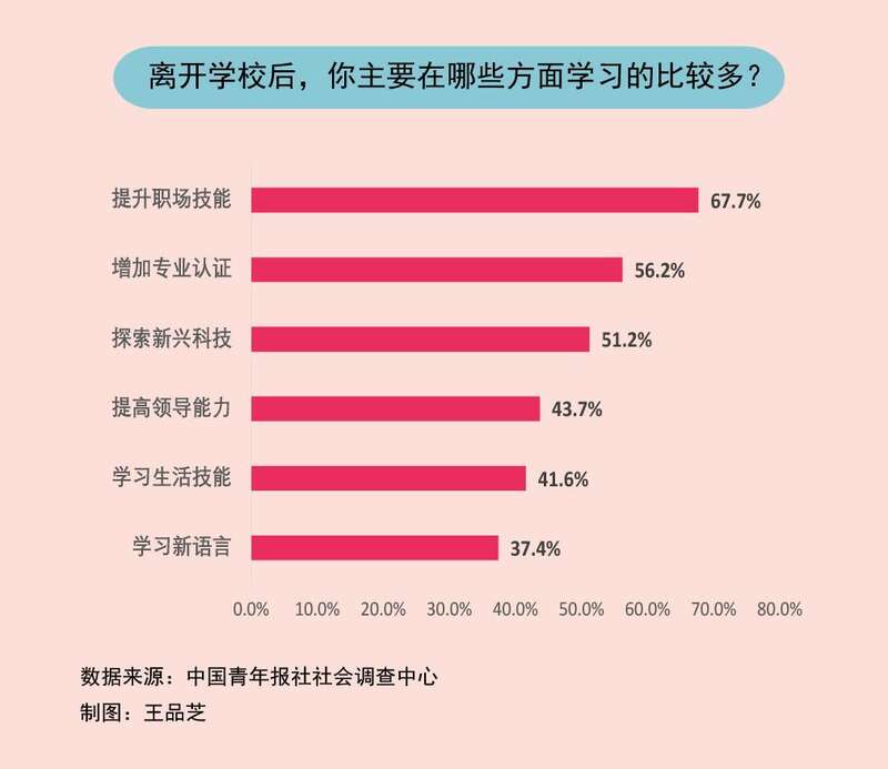 调查显示,离开学校后,大家主要在提升职场技能(67.7%)、增加专业认证(56.2%)、探索新兴科技(51.2%)方面学习得比较多,其他还有:提高领导能力(43.7%)、学习生活技能(41.6%)、学习新语言(37.4%)等。
