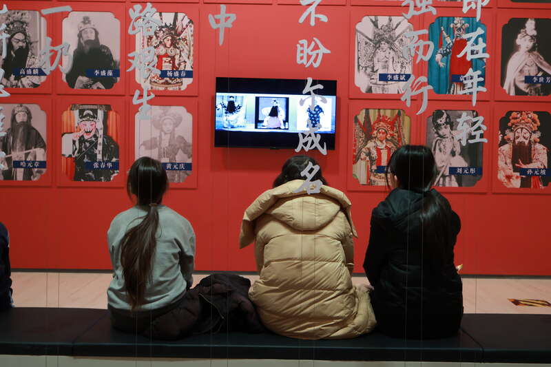 展览现场,观众观看富连成影像资料。李怡蒙/摄