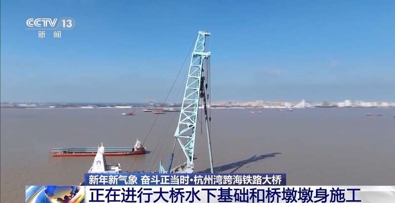 在浙江杭州湾海域,1600多名建设者正在杭州湾跨海铁路大桥进行大桥水下基础和桥墩墩身的施工。