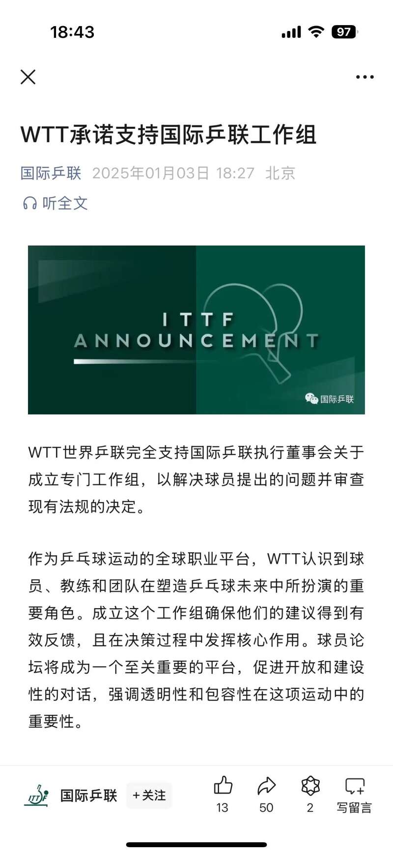 国际乒联微信公号3日晚发文:WTT世界乒联完全支持国际乒联执行董事会关于成立专门工作组,以解决球员提出的问题并审查现有法规的决定。查看详情
