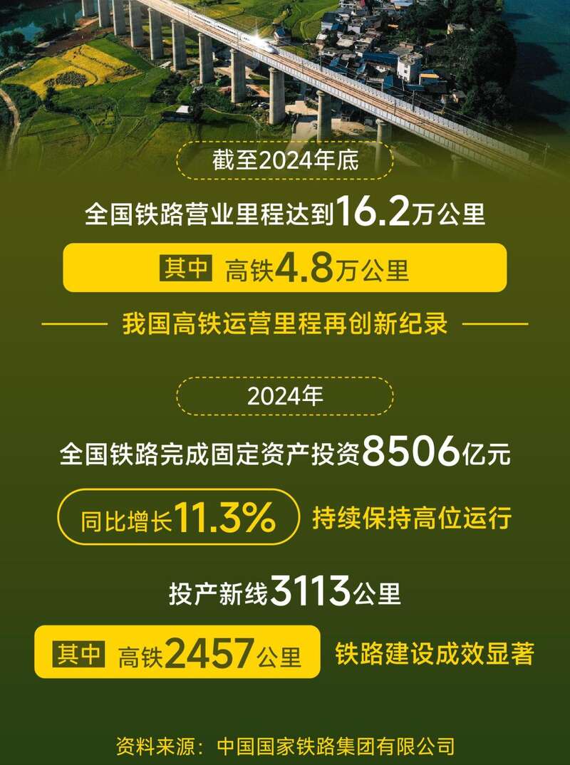 截至2024年底,全国铁路营业里程达到16.2万公里,其中高铁4.8万公里,我国高铁运营里程再创新纪录。