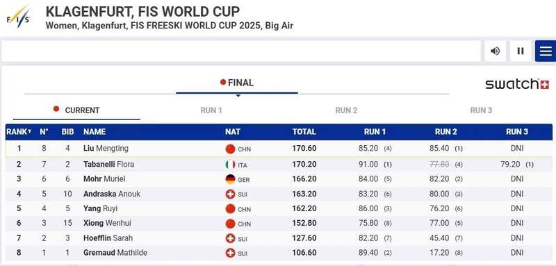以资格赛第一名进入决赛的刘梦婷,在决赛几乎复刻了资格赛的表现,第一轮完成Left Double 1080 Safety得到85.20分,第二轮完成Right Double 1080 Safety得到85.40分,以总分170.60分在第三轮出场前提前锁定头名,斩获首个世界杯冠军!