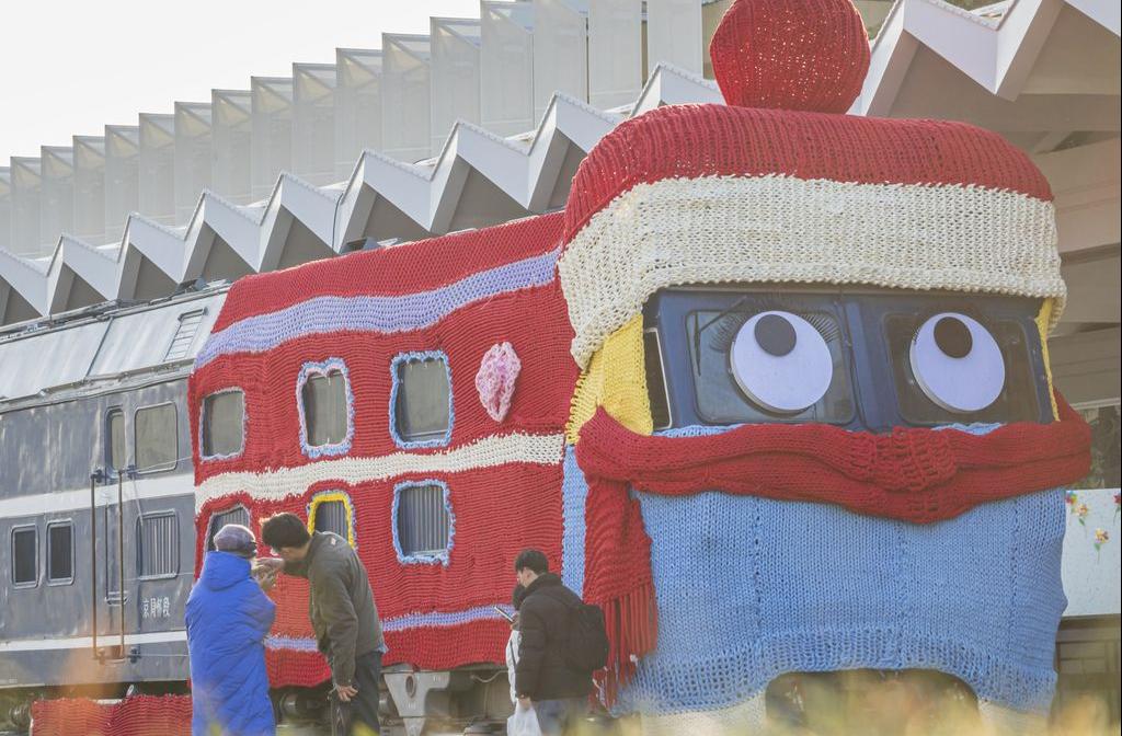 石家庄:火车头穿毛衣 造型萌趣可爱