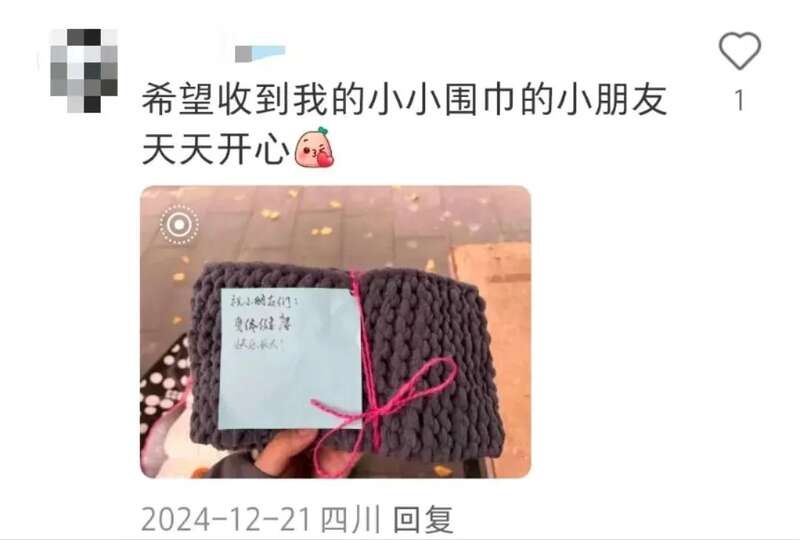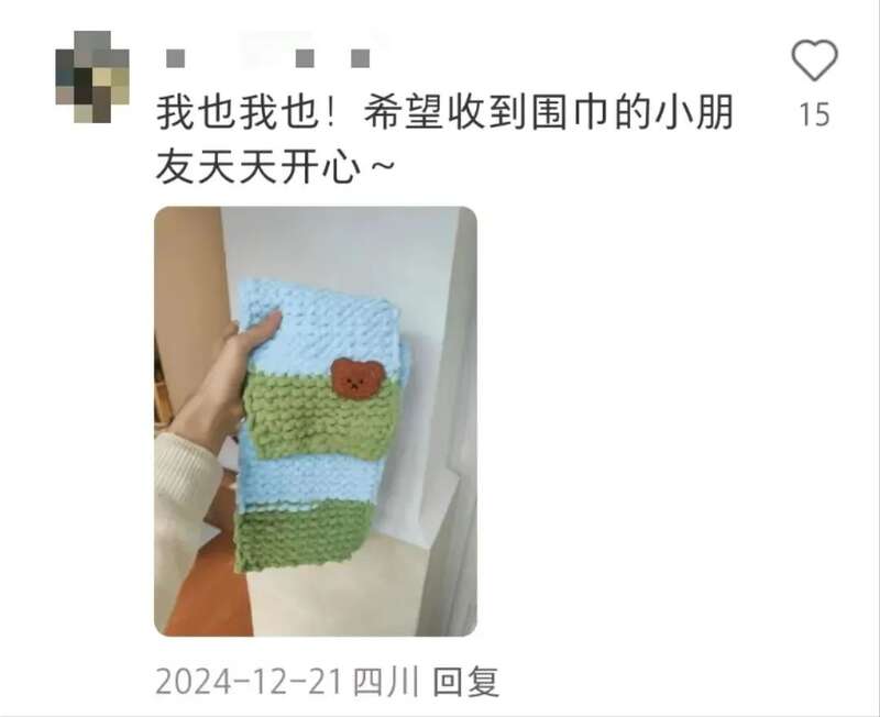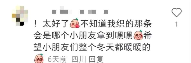 她在社交平台发布这条内容后,这群“手织围巾”的哥哥姐姐纷纷在评论区现身:“太好了,这么快就送到你们手里了。”“我织了两条,不知哪个小朋友会拿到。”