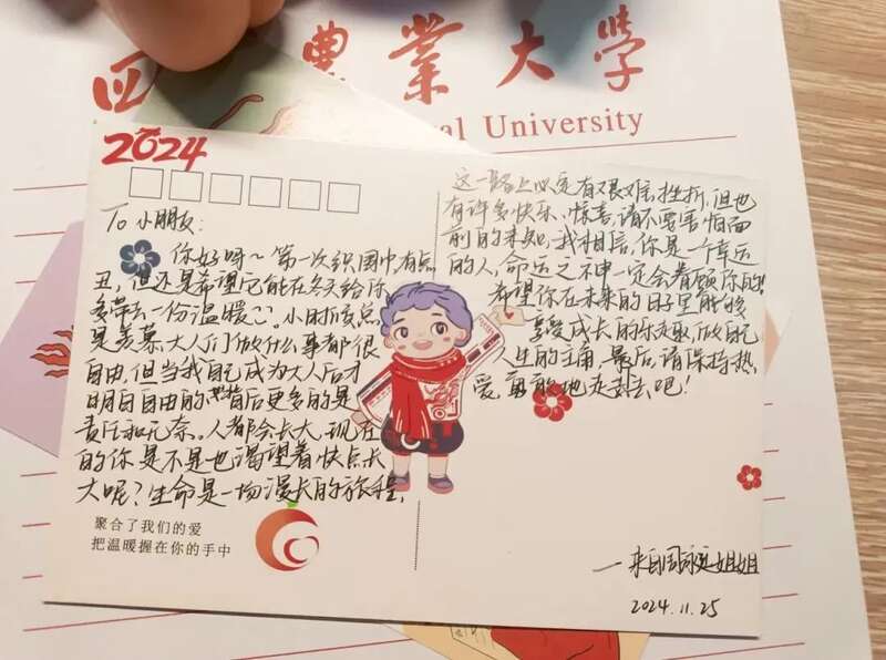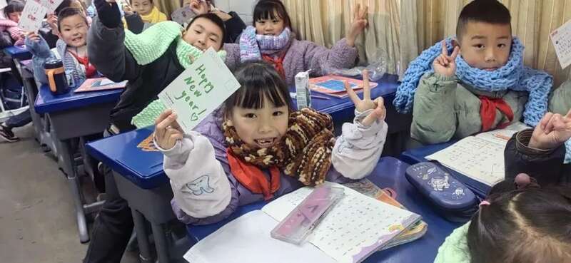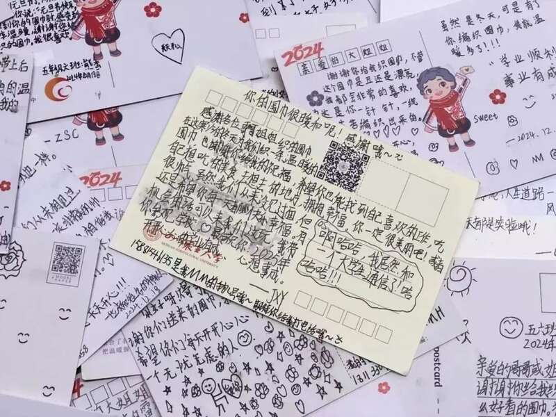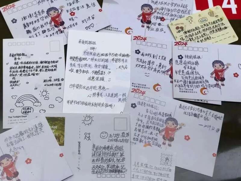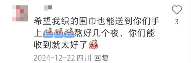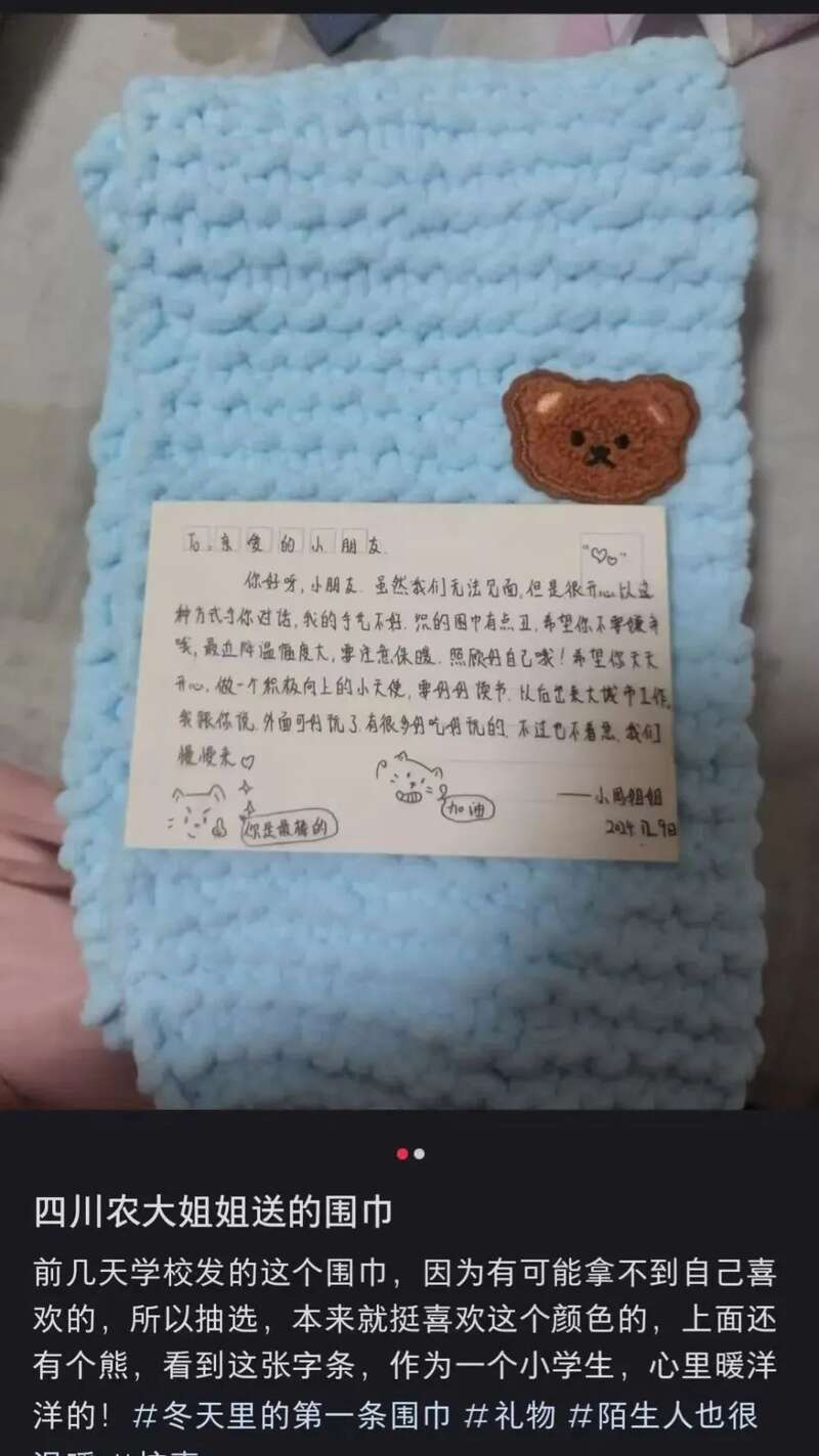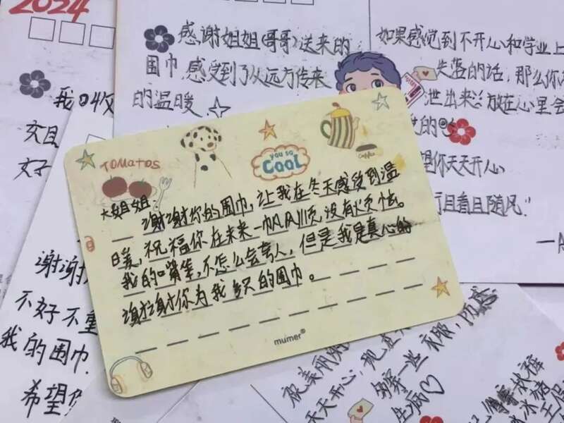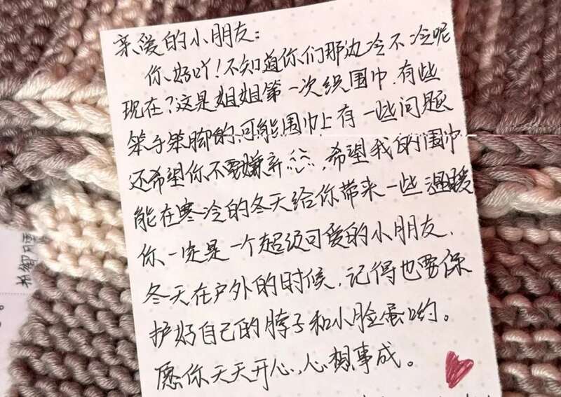 “感谢各位哥哥姐姐在寒冷的冬天,为我们织一条温暖的围巾,虽然我们从没见过面,但还是希望你每天都快乐幸福,2025年祝你开开心心、学业有成。”