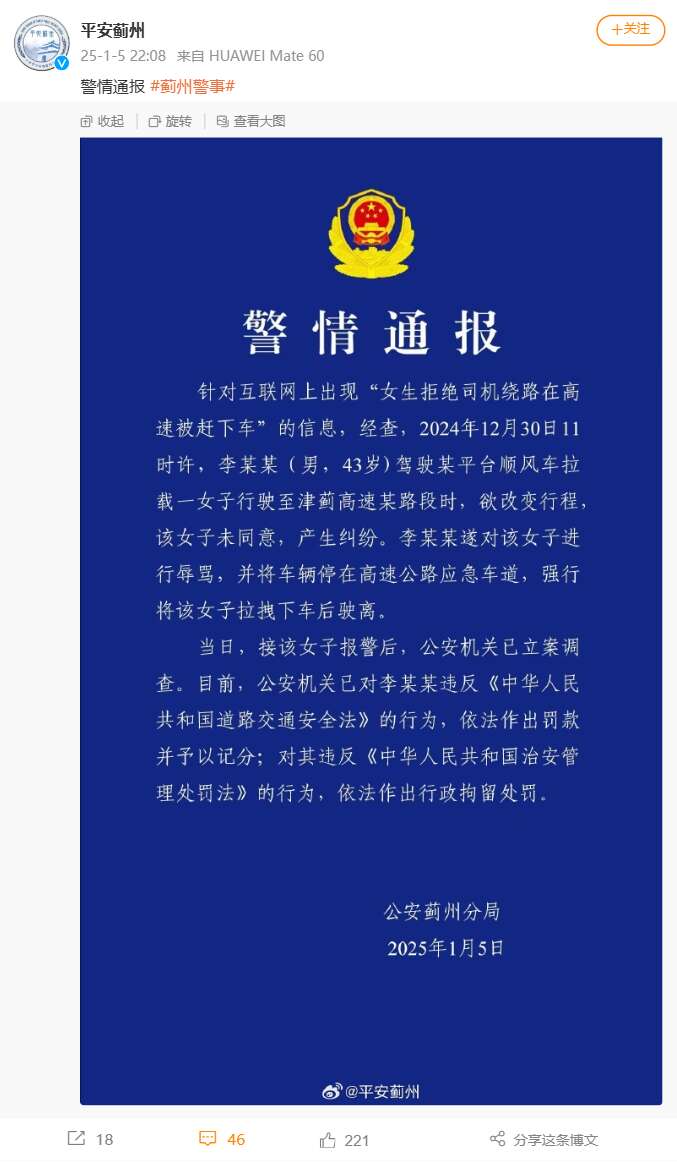 1月5日晚,针对互联网上出现“女生拒绝司机绕路在高速被赶下车”的信息,平安蓟州发布警情通报。