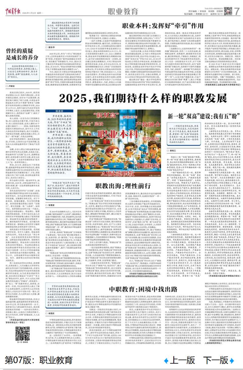 据中国青年报今日7版,2025年作为“十四五”规划全面收官之年,已到职业教育近5年改革发展的“交卷”时刻。我们约请职业院校学生、一线管理者和相关专家学者撰写文章,说出他们的新年愿景。