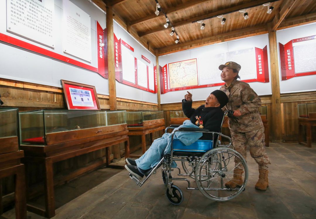 石阡县困牛山红军壮举纪念碑前,90岁退役军人龙文江与“90后”石阡长征国家文化公园建设服务中心工作人员刘臻,一老一少默立,敬献鲜花,缅怀先烈。“那时候我刚出生,后来听老人讲,当时国民党部队人数多,而红军人数少。红军不打老百姓,见到老百姓把枪朝天上打。国民党部队就抓了很多百姓来给他们挡枪。后来实在没有办法了,红军就把枪砸了,然后从70多米高的悬崖上跳了下去。”回忆往昔,龙文江老人声音微微颤抖,眼中闪烁着泪光。