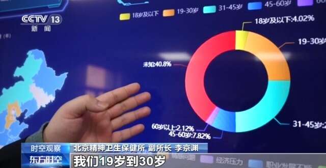 北京精神卫生保健所副所长 李京渊:可以看到我们地图的颜色,各省的来电量会根据来电量的多少,通过颜色由深到浅进行展示。北京、河北来电量是比较多的。通过人群分布、年龄分布我们可以发现,19岁到30岁,还有31岁到45岁年龄段的来电者的占比比较高。从来电原因可以发现,包括家庭成员的关系紧张、情感问题、职业发展、孩子教育等等。还有来电的情绪问题可以发现,像焦虑、恐惧、紧张以及抑郁情绪等,这些情绪占来电量的比例也是比较高的。