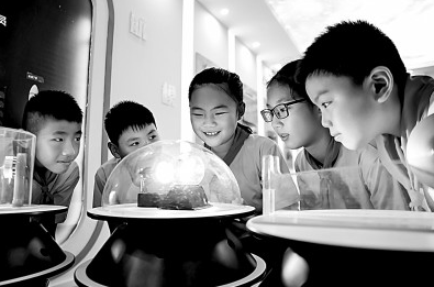江西省南昌市青云客航天科创空间青少年科普馆,孩子们在观察光压传动试验。鲍赣生摄/光明图片
