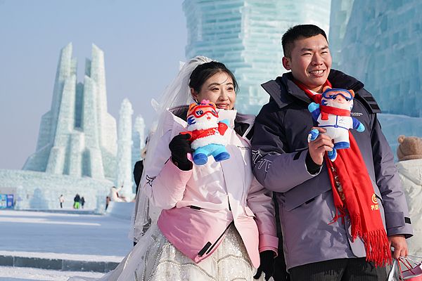2025年1月6日,黑龙江哈尔滨,来自北京、上海、黑龙江等17个省、自治区和直辖市的42对新人在哈尔滨冰雪大世界举办集体婚礼。42对新人手捧亚冬会吉祥物“滨滨”和“妮妮”,牵手走上喜庆的典礼台,完成婚典仪式。哈尔滨公益冰雪集体婚礼是中国首个以冰雪为载体的婚礼大典活动,共有来自全球五大洲20多个国家的1320对新婚和纪念婚夫妇在哈尔滨开启幸福的婚姻旅程。图为新人手拿亚冬会吉祥物与冰雪大世界主塔同框。 中新社记者 赵宇航 摄