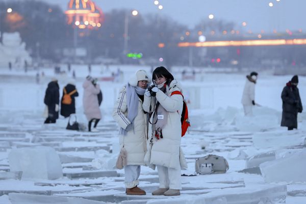 2025年1月4日,黑龙江哈尔滨,松花江边沙滩部落“钻石海”,引来了全国各地游客前来旅游打卡。 钻石海位于松花江畔沙滩部落附近,由采冰剩余的冰块形成,阳光下如钻石般闪耀,是哈尔滨旅游必打卡景点之一。